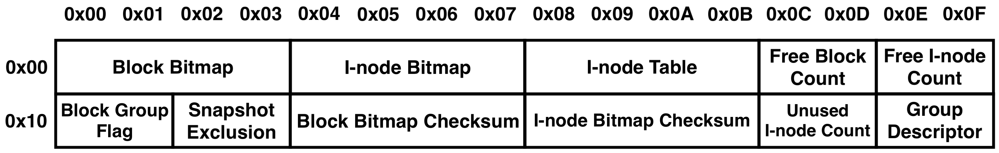 Group Descriptor Entry: 파일 시스템 내의 각 Block Group에 대한 정보를 저장한다. 하나의 Block Group은 하나의 Group Descriptor Entry에 할당되며, Group Descriptor Entry의 크기는 Super Block에 명시되어 있다. Group Descriptor Entry는 해당 Block Group에 할당된 Block Group의 Block Bitmap, Inode Bitmap, Inode Table의 시작 주소, 가용상태의 Block 수 (Free Block Count), 가용상태의 Inode 수 (Free Inode Count), 사용하지 않은 Inode 수 (Unused Inode Count) 등의 정보를 포함한다.