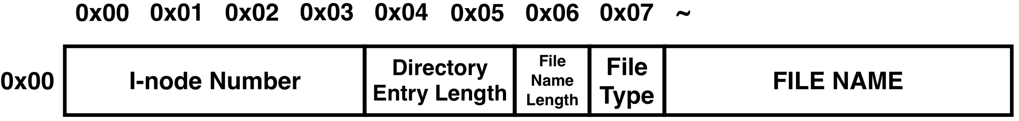 Directory Entry: 해당 Directory 이하의 모든 파일 혹은 디렉터리마다 할당되어 정보를 저장하는 Entry이다. Directory Entry는 해당 디렉터리 이하에 존재하는 파일의 Inode Number, Directory Entry Length, File Name Length, File Type(해당 Directory Entry가 파일인지, 디렉터리인지 구별), File Name 정보를 포함한다.