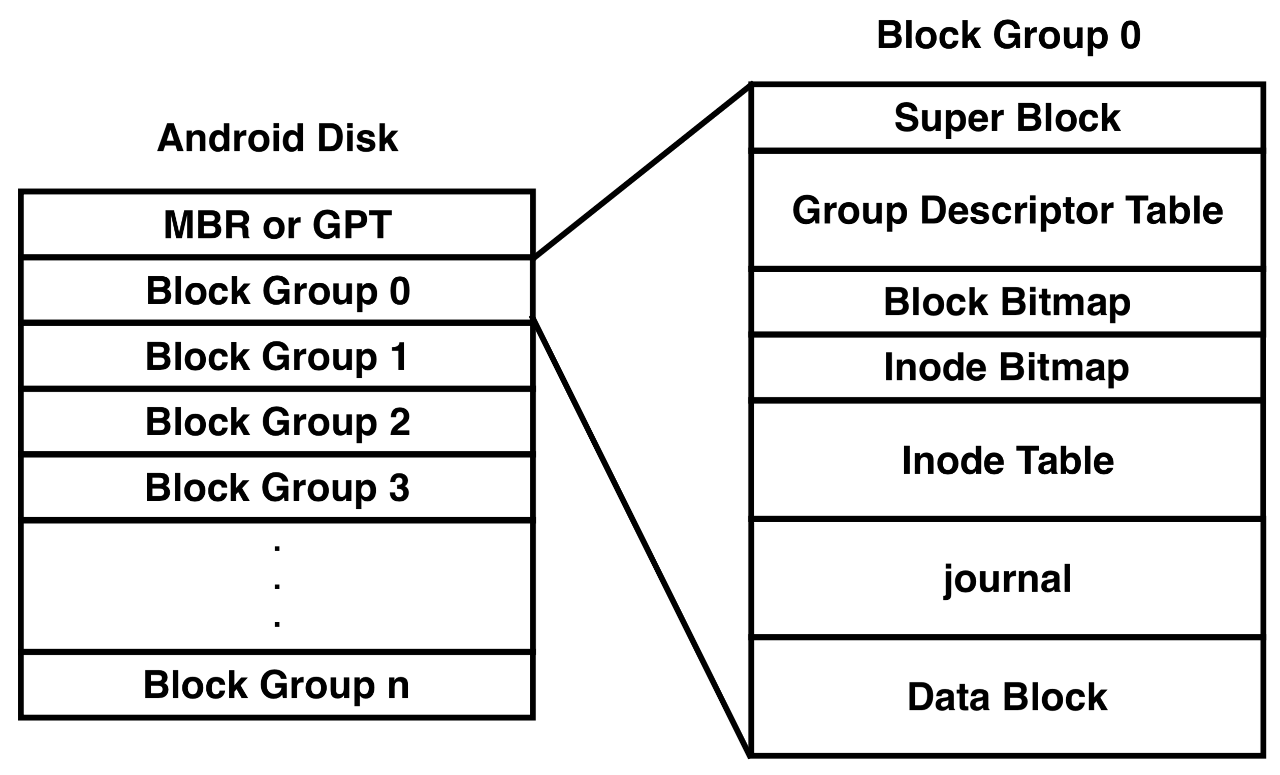 Ext4(Extended File System): 리눅스 기반 시스템에서 널리 사용되는 파일 시스템으로, 주로 안드로이드의 파일 시스템으로 사용된다. 안드로이드는 리눅스 커널을 기반으로 하기 때문에, Ext4는 안드로이드 장치에서 데이터의 저장, 검색, 관리를 효율적으로 수행하기에 적합하다. 때문에 모바일 포렌식 그중에서 안드로이드 포렌식을 위해서는 Ext4 파일 시스템을 상세하게 이해할 필요가 있다.