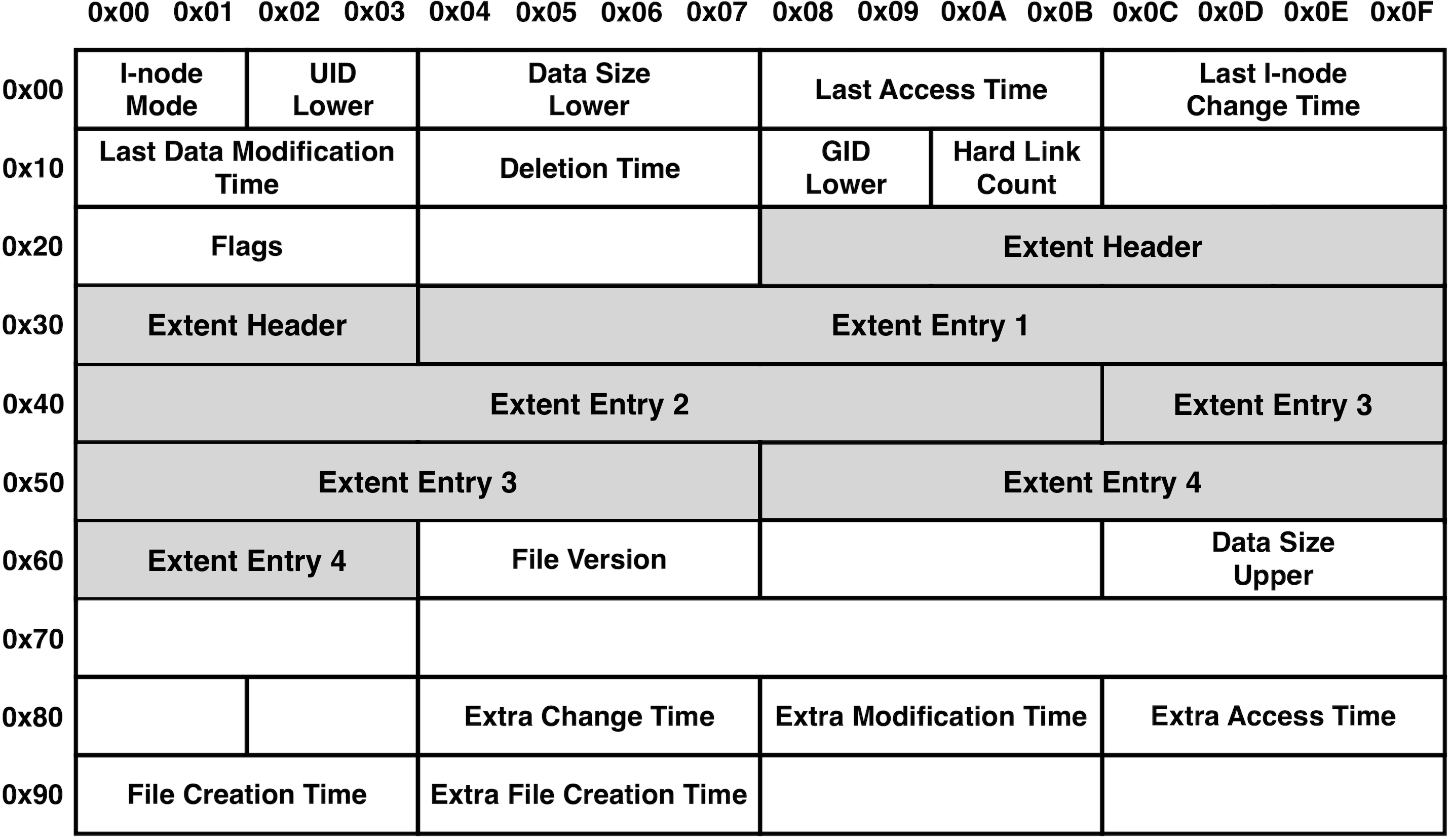 | 0x2C ~ 2D | 2 | Max Number of Entries (Inode Entry 내부의 최대 Extent Entry 수) (최대 값 = 4) |