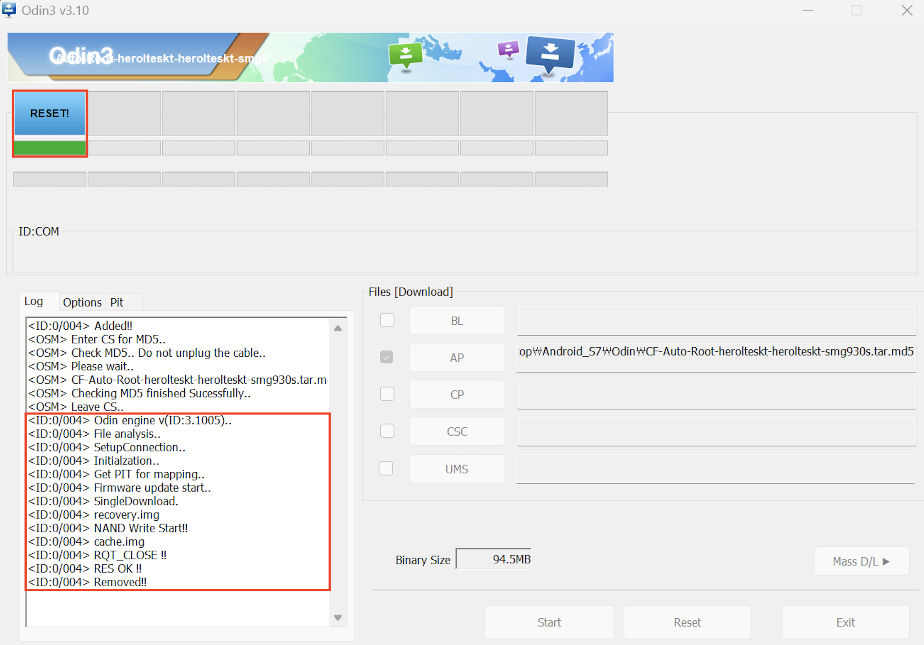 초록색 항목 위에 파란색으로 "RESET"이 활성화되고 "Log" 항목에 다양한 문구가 나타난다. 시간이 지나면 "Pass" 문구와 함께 Rooting이 완료된다.