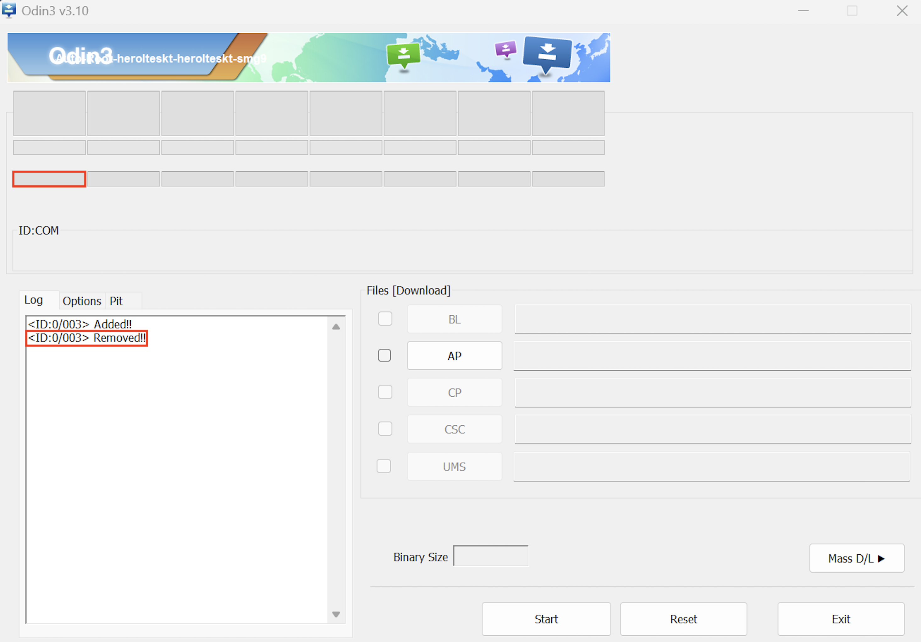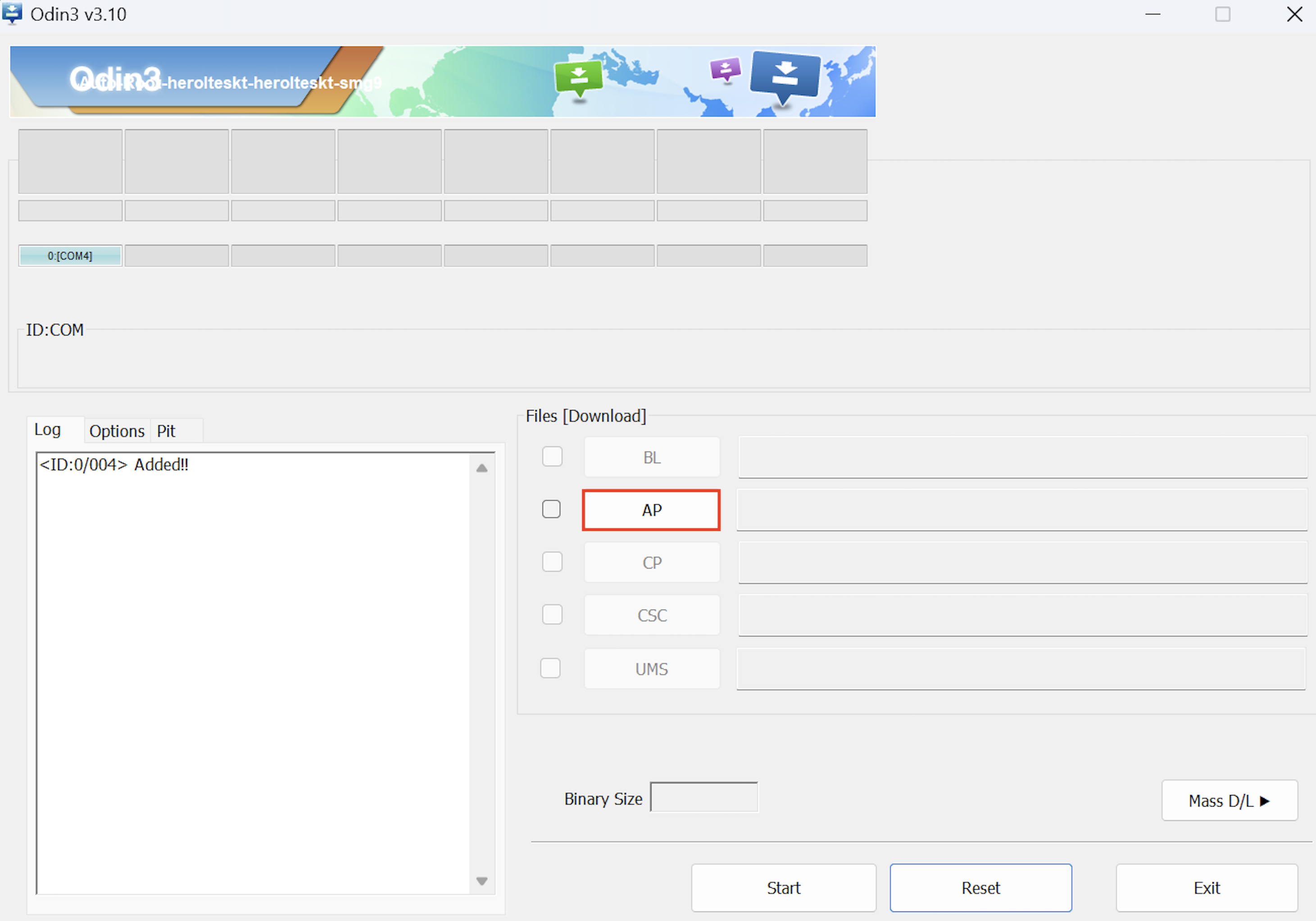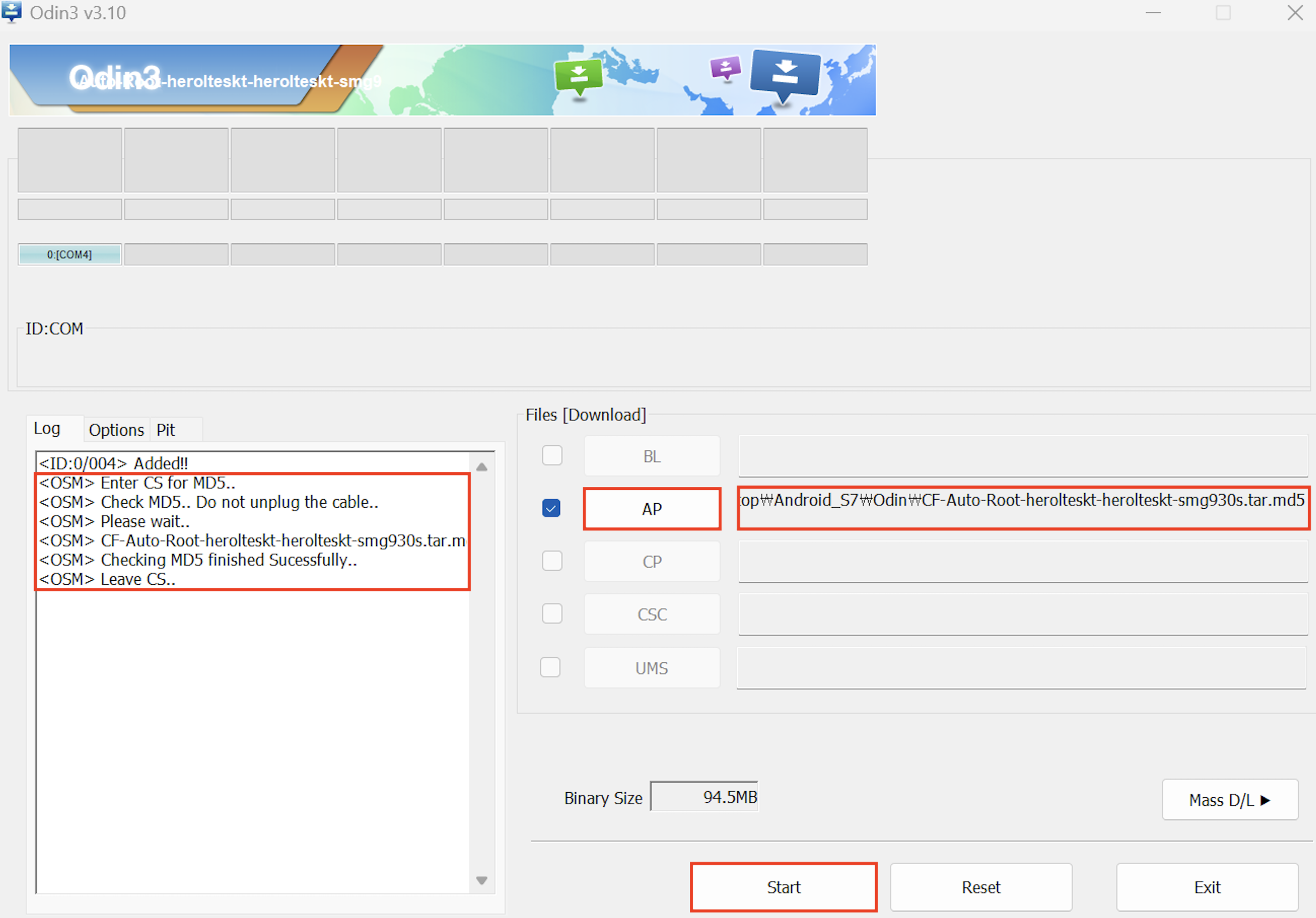 안드로이드 기기의 다운로드 모드 진입 이후에, 기기를 PC에 연결하면 "Added" 문구와 초록색 항목이 하나 활성화되고, "AP" 영역을 선택하여 "md5" 확장자 파일을 선택한다. "Added" 문구 위에 존재하는 "Options"을 선택하여 안드로이드 "재부팅 방지" 항목을 활성화한다. 루팅과정에서 잦은 재부팅으로 루팅을 실패할 수 있기 때문이다. 이후에 "Start" 버튼을 눌러 Rooting을 실행한다.