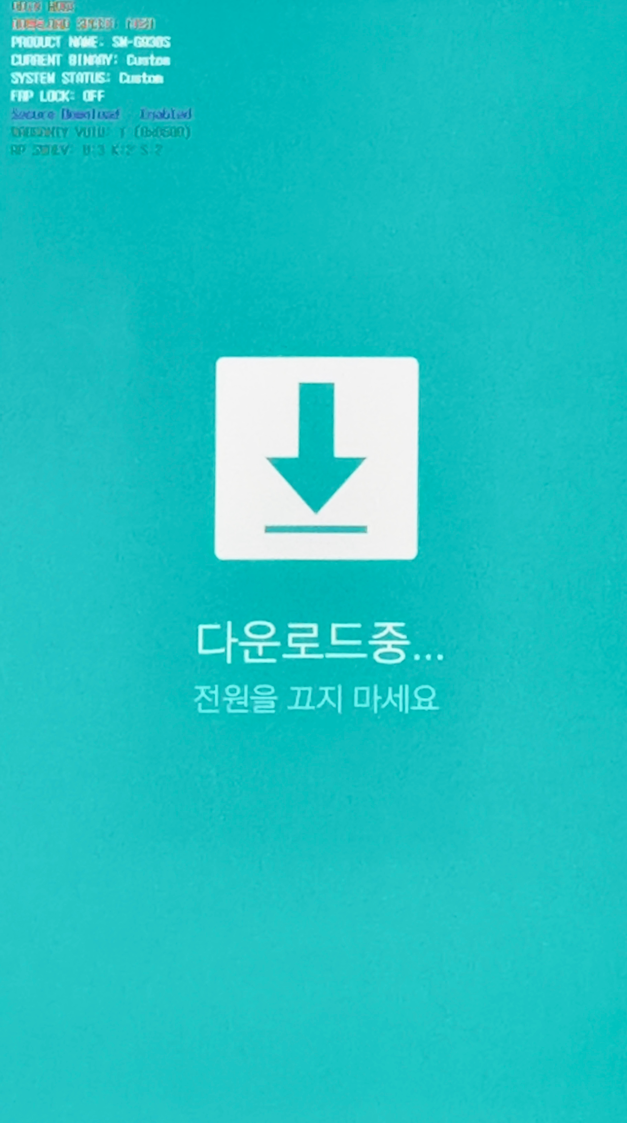 "md5" 파일을 이용해 Rooting 하는 과정에서 안드로이드 기기는 다운로드 모드 상태여야 한다. 안드로이드 기기의 전원을 끄고, 다운로드 모드 진입 후 USB를 연결한다. 아래는 다운로드모드 진입화면이다.