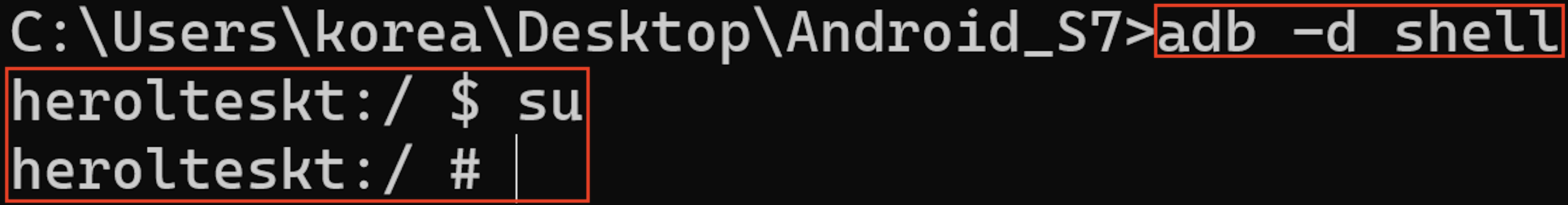 "adb -d shell" 명령어를 이용하면 PC에 USB로 연결된 안드로이드 기기의 shell로 진입할 수 있다. 이후에 "su" 명령어를 사용하여 Root 권환이 획득되었는지를 확인한다.