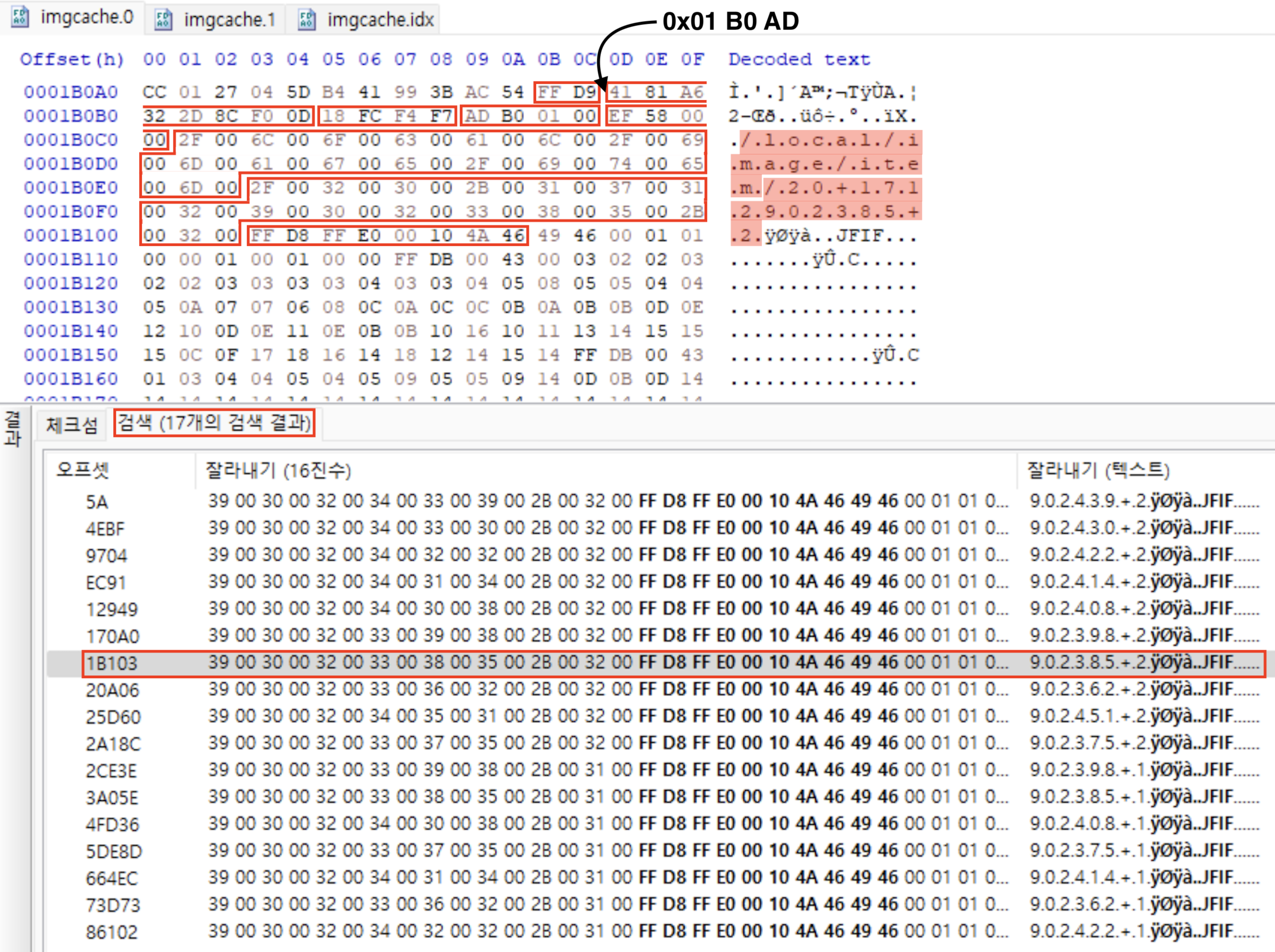 [content].0 파일의 '0x01 B0 AD' 번 째 논리 주소 값을 확인하면, Thumbcache 파일이 내부적으로 Thumbnail 파일을 저장하는 고유한 구조체가 존재함을 확인할 수 있다. 추가적으로 Thumbcache 파일은 Thumbnail 구조체를 연속적으로 저장하기 때문에 해당 Thumbnail의 시작 논리 주소에서 2Byte 이전의 값에 직전의 Thumbnail jpg 파일의 Footer Signature가 존재함을 확인할 수 있다.