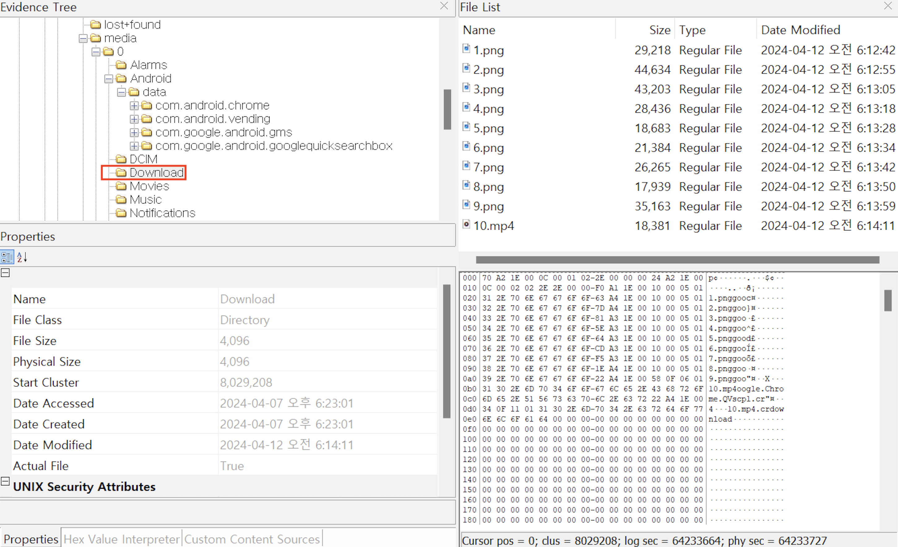 10개의 그래픽 파일이 전부 다운로드 하고, 해당 Android 기기를 이미징하여 FTK Imager로 'Download' 디렉터리를 확인한 결과 10개의 그래픽 파일이 모두 정상적으로 존재함을 확인할 수 있다.
