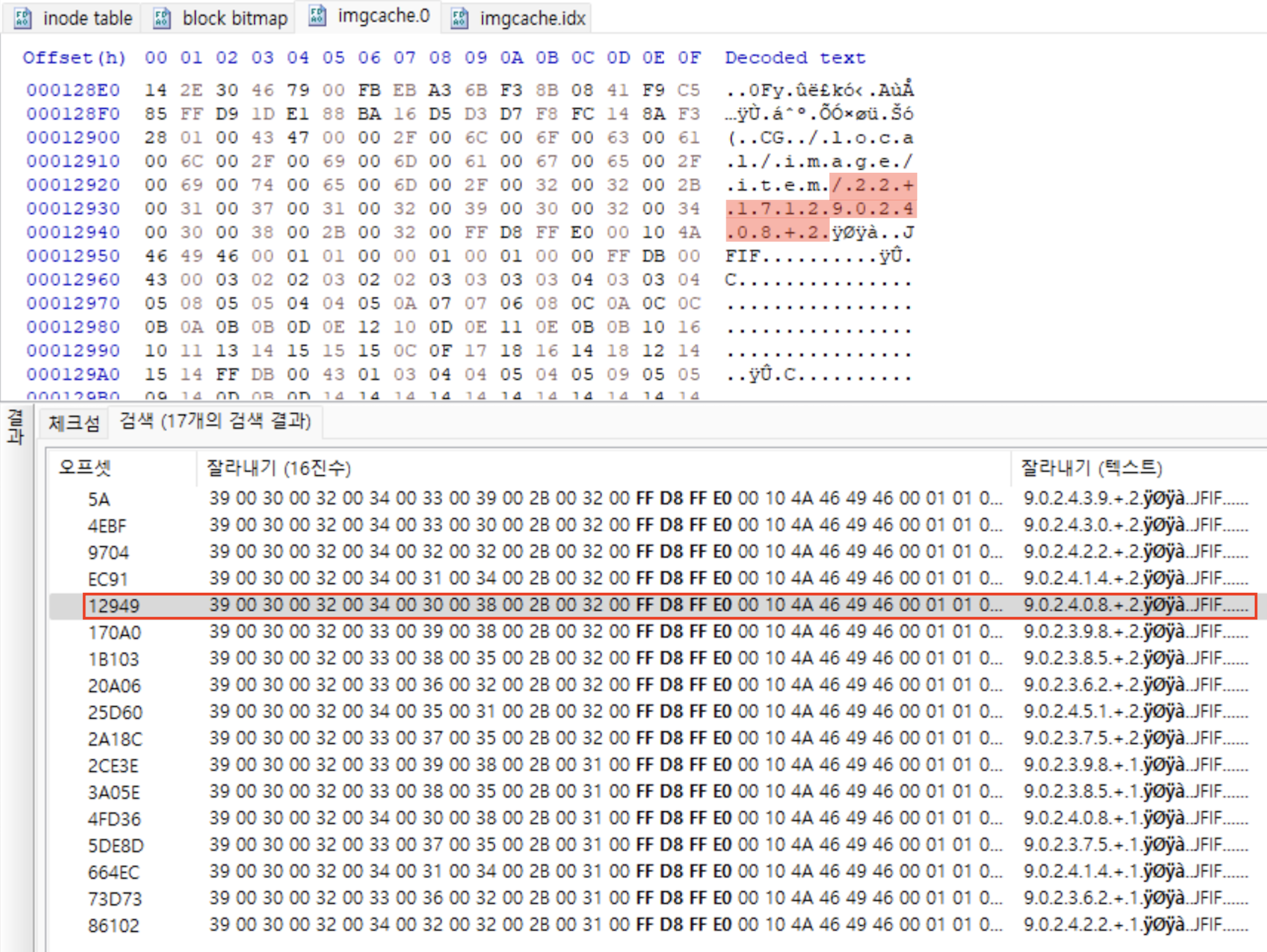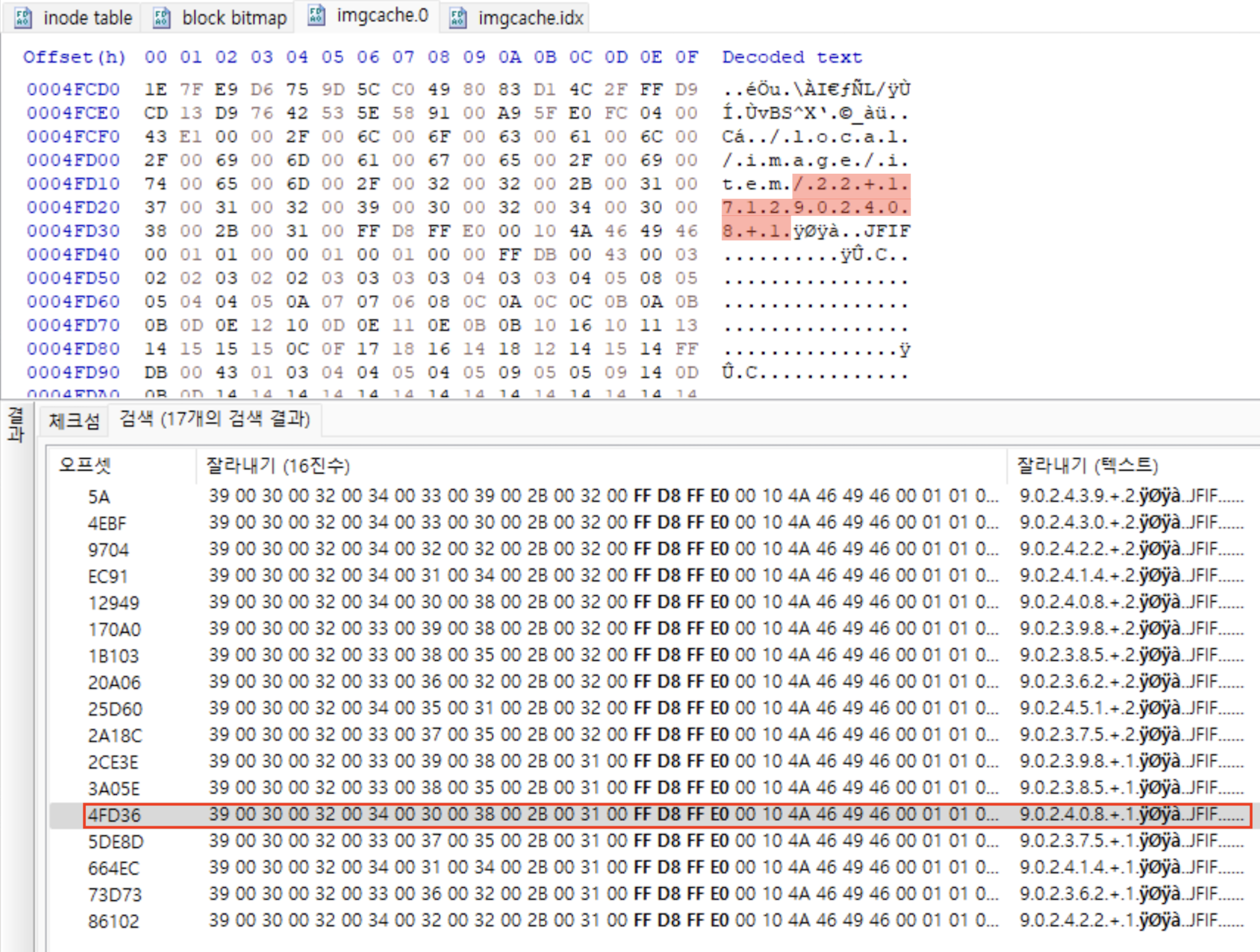 아래는 Inode Table에서 마지막 데이터 수정 시간을 '0x08D11866'로 갖는 Inode Entry를 추출한 모습이다. 이미지 갯수가 적거나 갤러리 내부에 비슷한 그래픽 파일이 많지 않은 경우, 육안으로 원본 그래픽 파일의 연관성을 유추하고 이후에 마지막 데이터 수정 시간 Field 값을 비교해 검증하는 방식으로도 가능할 것이다.