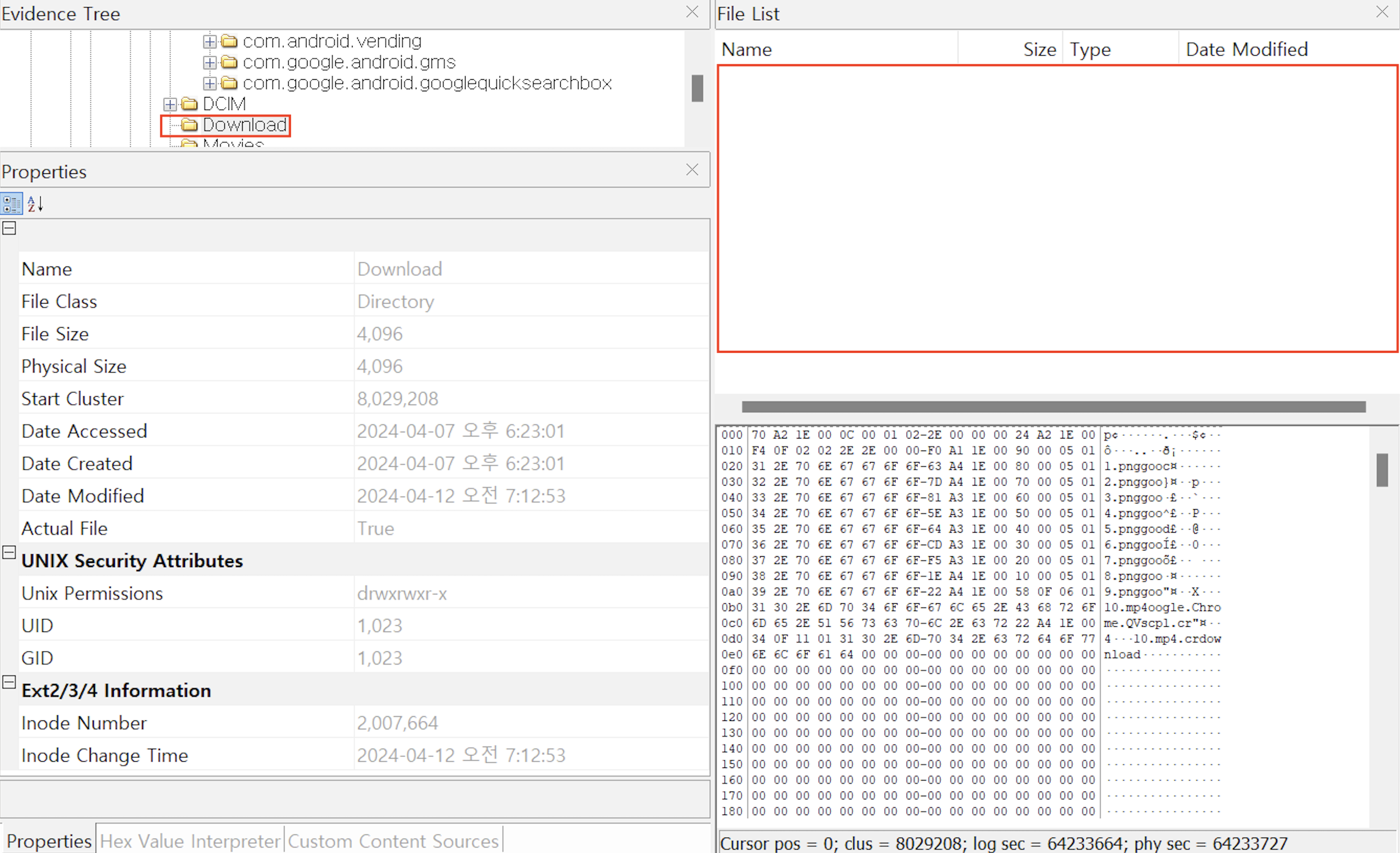 갤러리에서 10개의 그래픽 파일을 전부 삭제한 이후에 Android 기기를 이미징하고 FTK Imager로 이미지 파일을 분석한 결과이다.