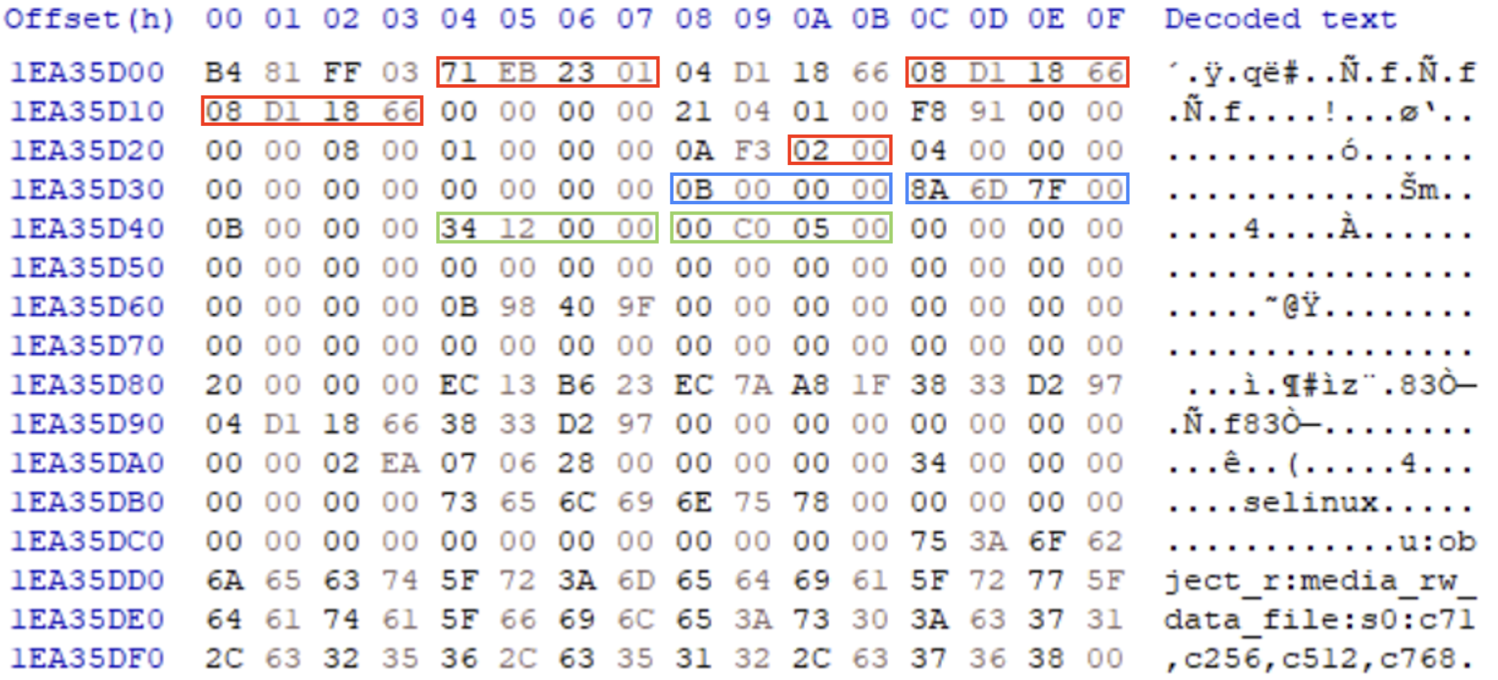 아래는 [content].idx 파일의 첫 번째 Index Entry의 모습으로, Thumbnail Index 값은 '0x41 81 A6 32 2D 8C F0 0D', Thumbnail Offset 값은 '0x01 B0 AD' 값을 갖는다. 이는 해당 Index Entry가 [content].0 파일의 '0x01 B0 AD'번 째 논리주소로 시작하는 특정 Thumbnail을 포인팅하여 접근함을 알 수 있다.