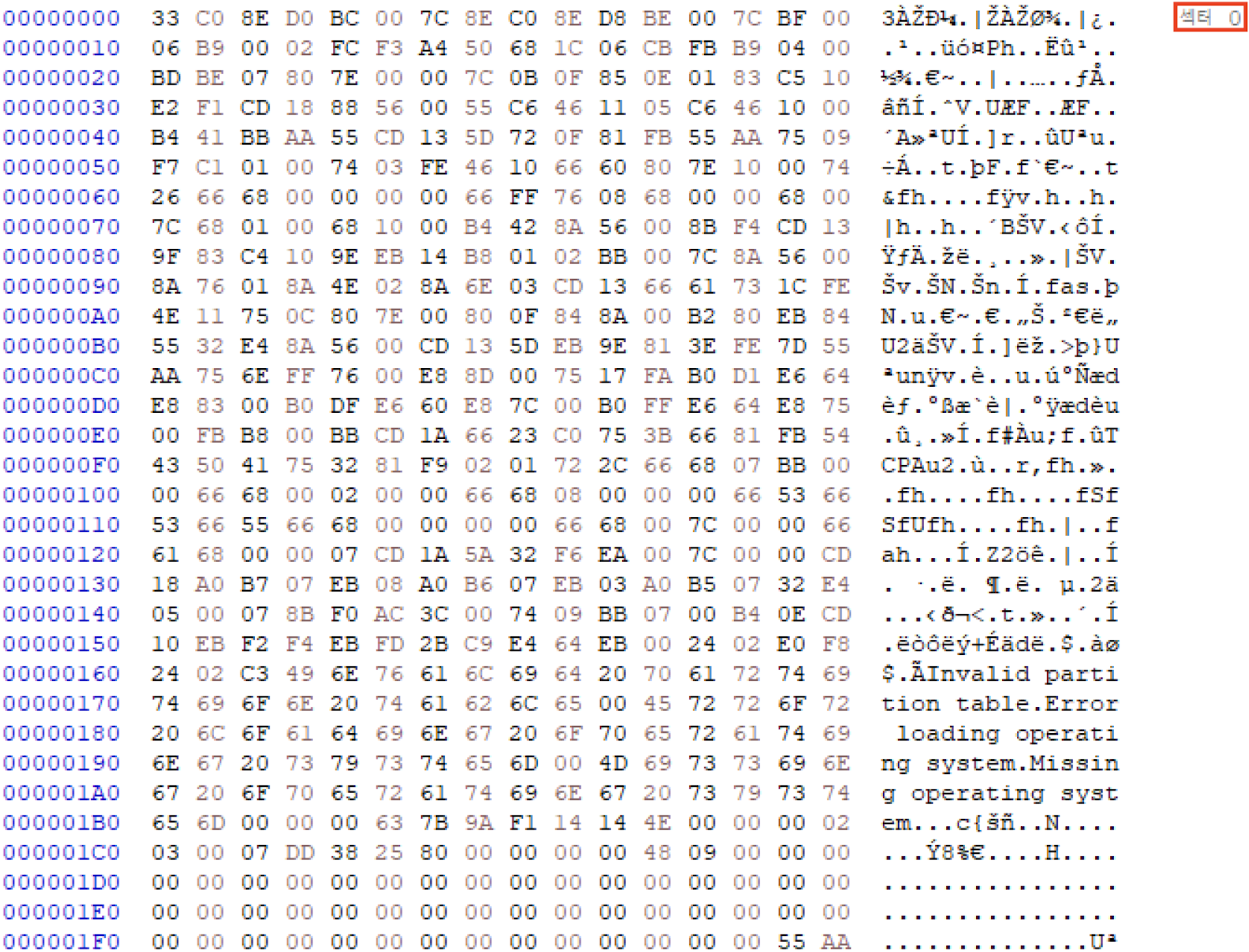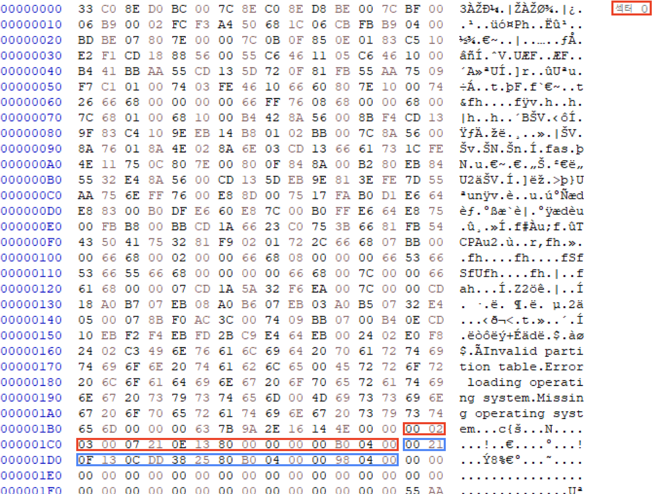 첫 번째 Partition Table Entry의 Partition Type이 '0x07'이라는 정보와 Starting LBA가 ‘0x80’이라는 정보를 알 수 있다. 해당 정보를 통해 첫 번째 파티션은 Starting LBA가 128번 섹터인 NTFS 파티션을 가진다는 사실을 알 수 있다.