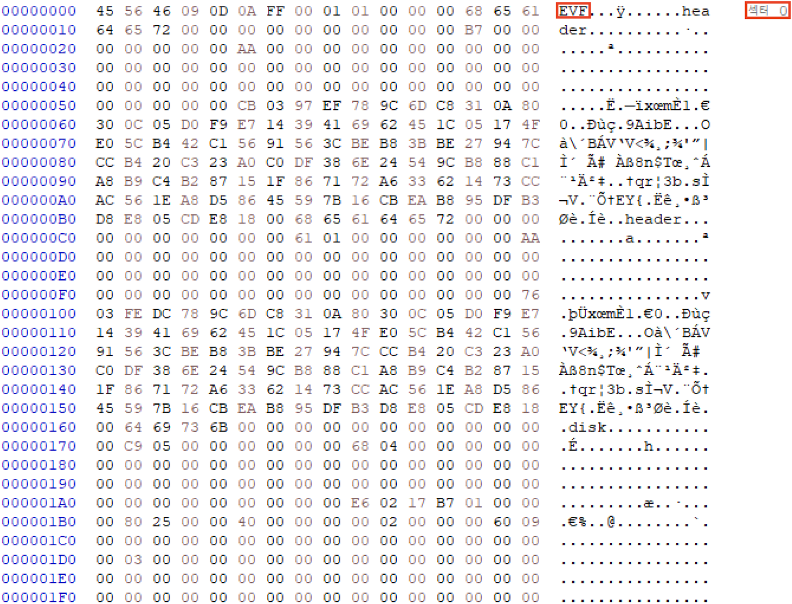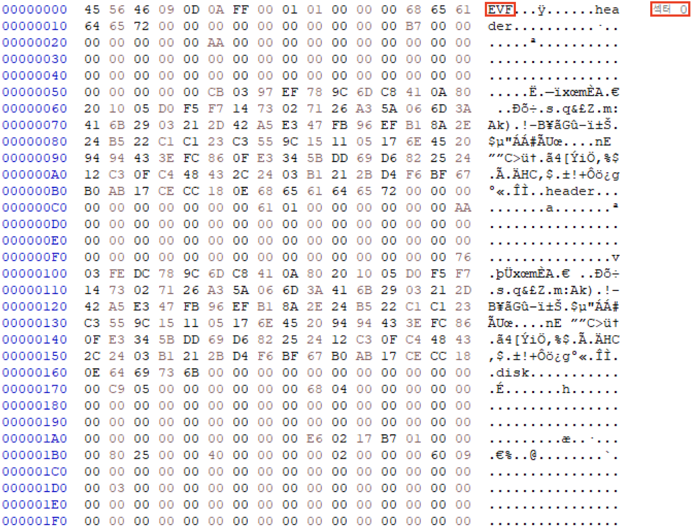 특징으로는 0번 섹터에 EVF(Encrypted Volume Footer)라는 텍스트가 존재한다.