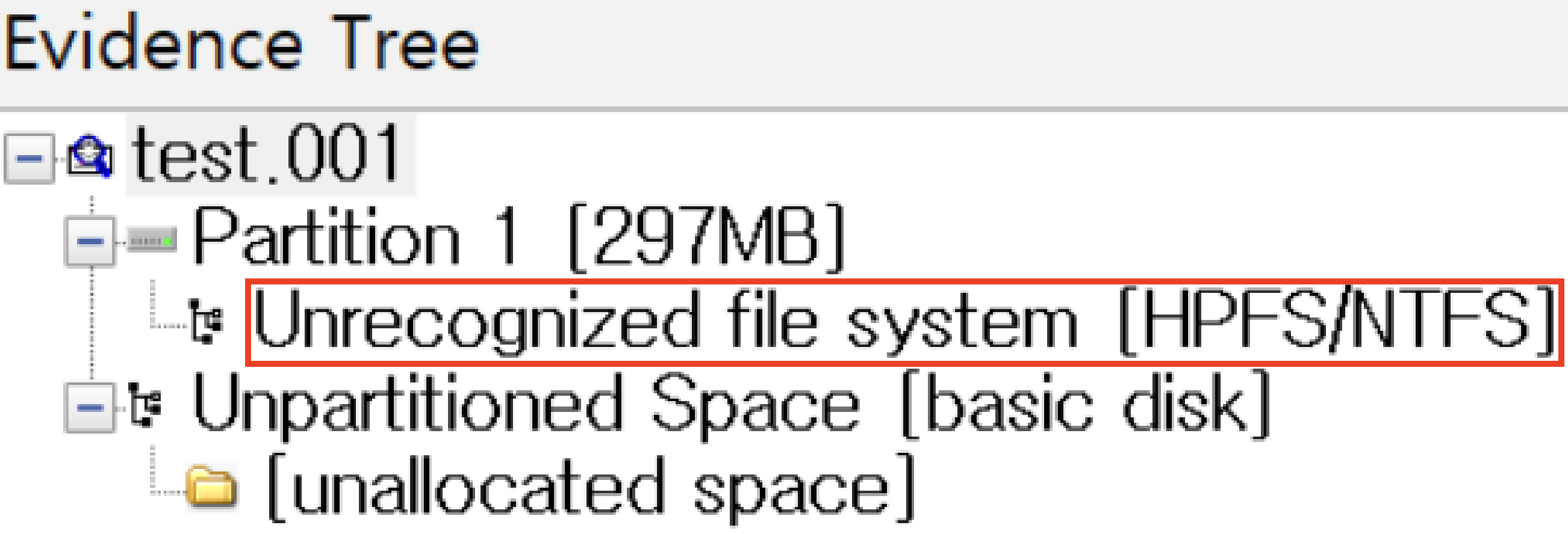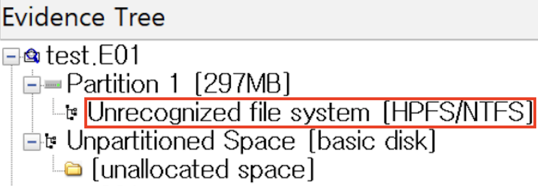 아래는 비트라커가 적용된 단일 파티션을 E01으로 이미징 하고 FTK Imager의 Avidence Tree에 업로드한 경우로, Unrecognized File System문구가 나타난다.