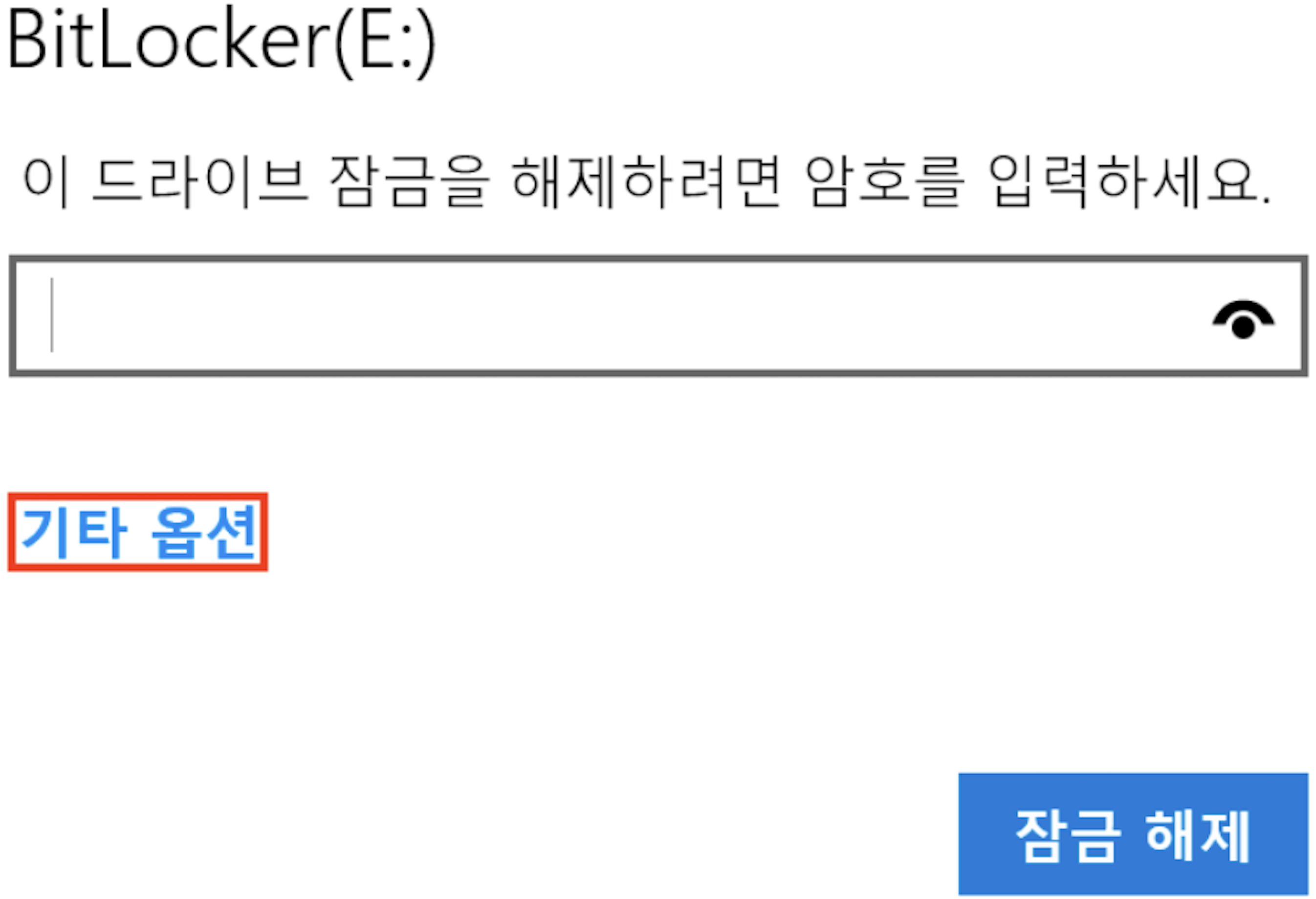 비트라커가 적용된 드라이브를 복호화하기 위해 드라이브를 선택하면 다음과 같은 화면이 나타난다. 이때 암호는 처음 비트라커를 적용할 때 직접 입력한 암호이다.