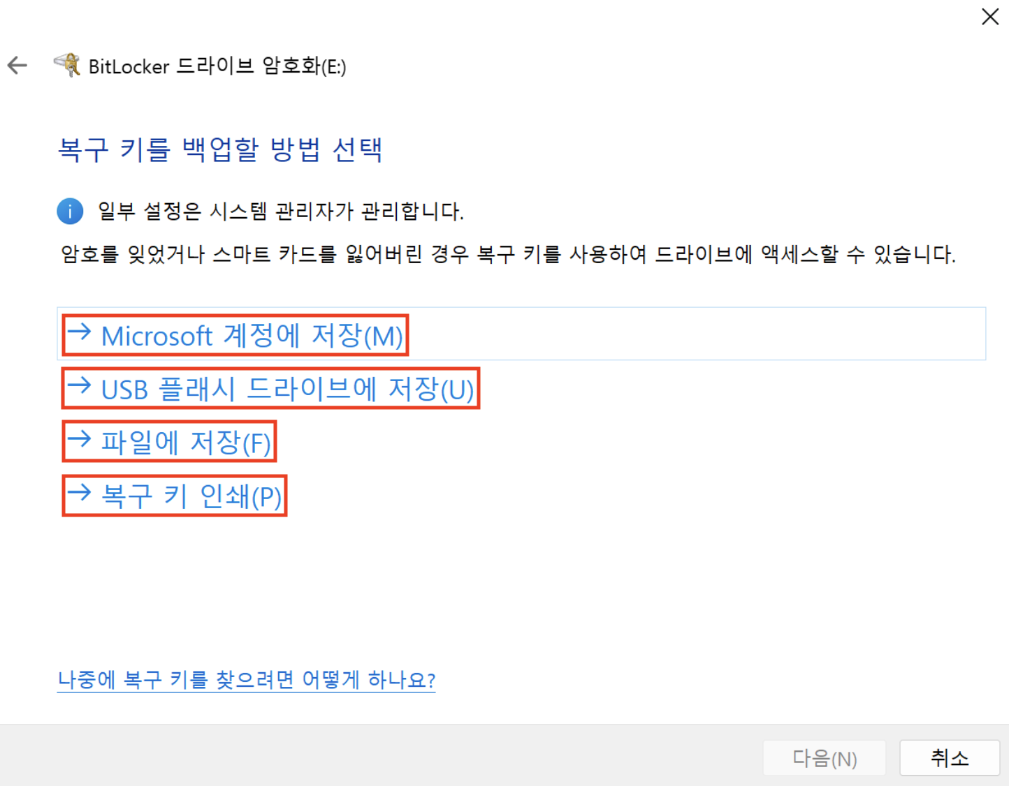 추가적으로 '암호를 사용하여 드라이브 잠금 해제'를 선택하고 암호를 입력하면 아래처럼 복구 키를 어떻게 백업할지 선택하는 창이 나타난다.