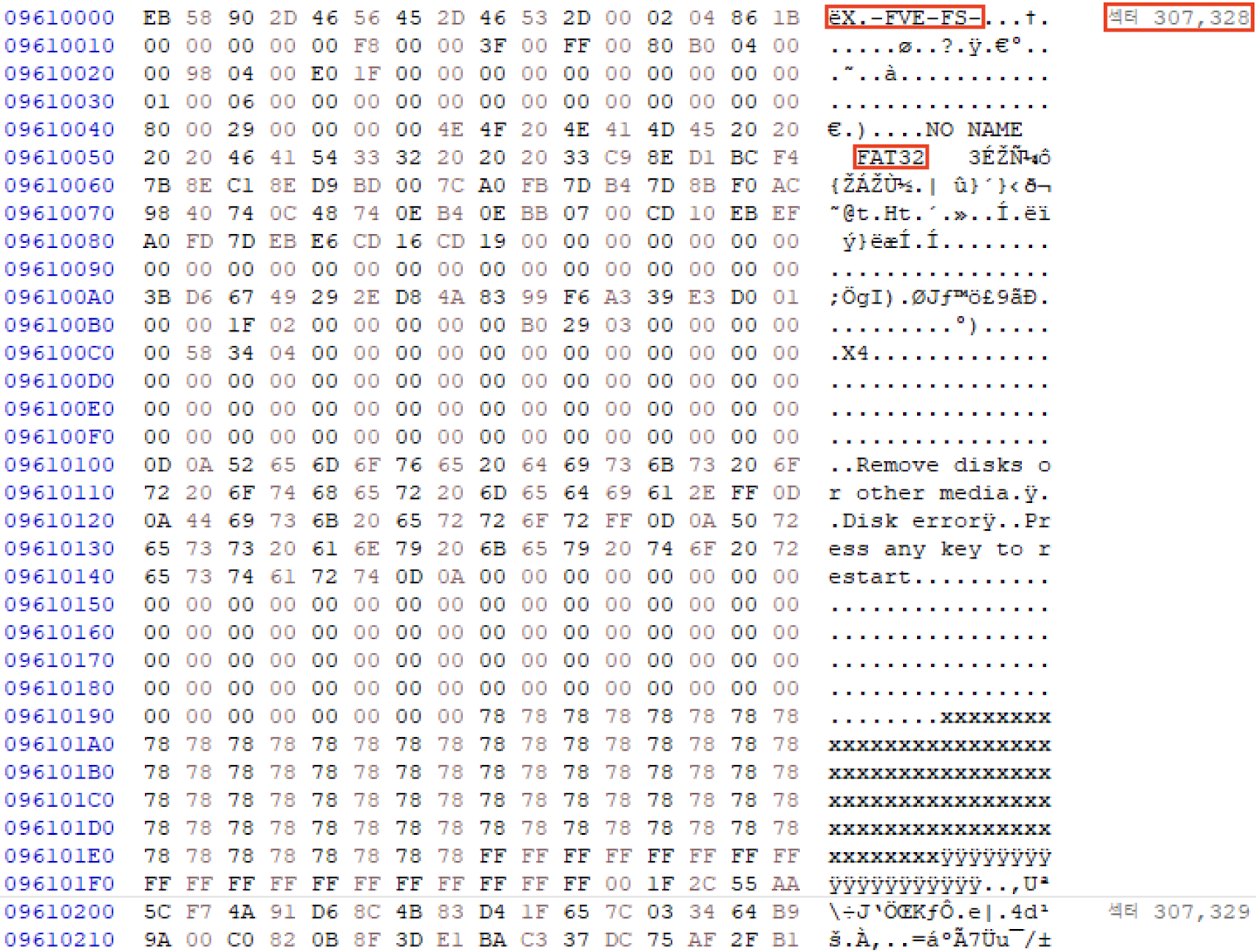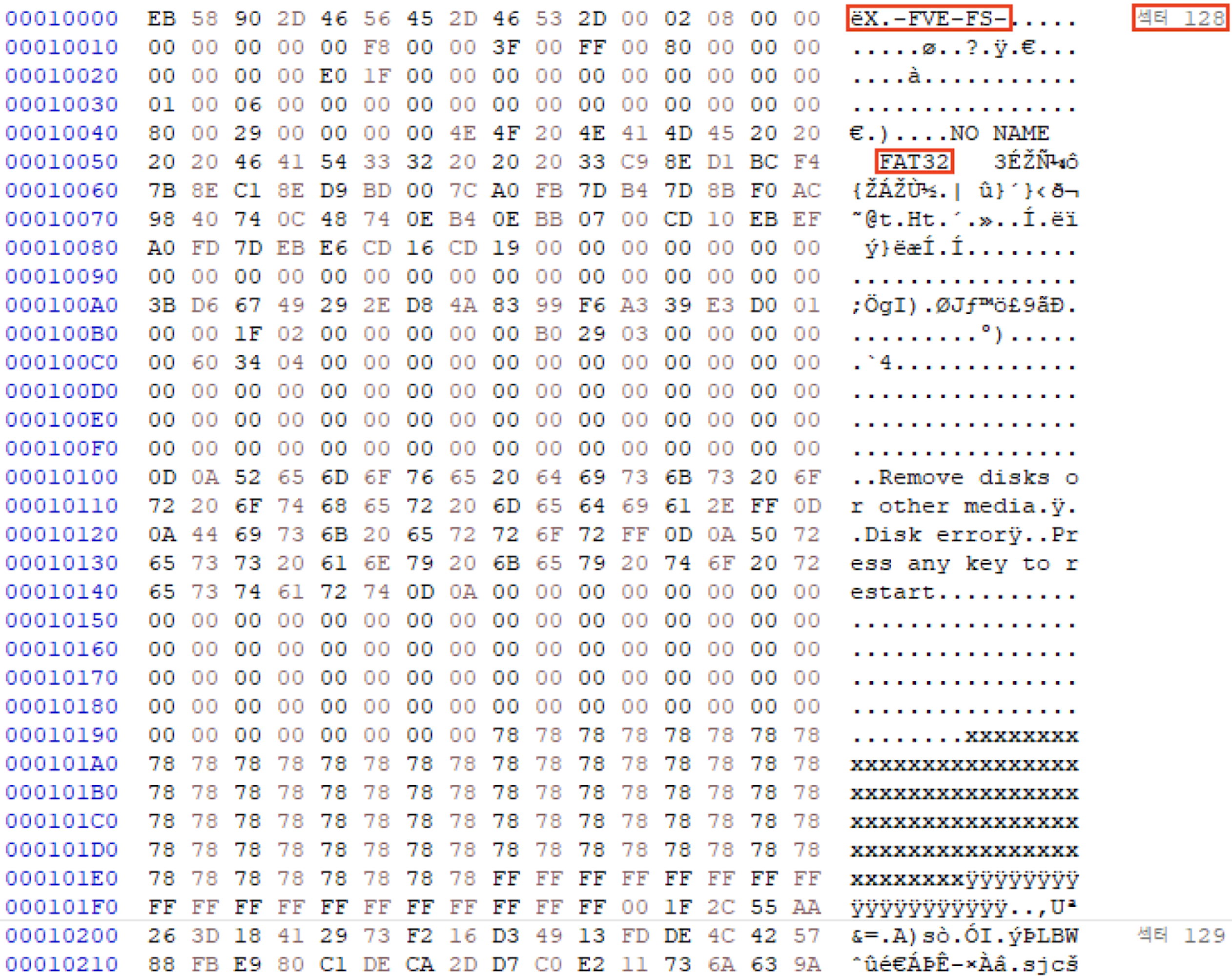 추가적으로 첫 번째(128번 섹터), 두 번째(307,328번 섹터) 파티션의 Boot Sector에 접근해 보면 모두 'FVE-FS-' 문구가 존재한다. 또한 NTFS, FAT32의 파일시스템에 상관없이 FAT이라는 텍스트가 존재하며, 다음섹터에 BOOTMGR 혹은 RRaA와 같은 문구 또한 존재하지 않는다.