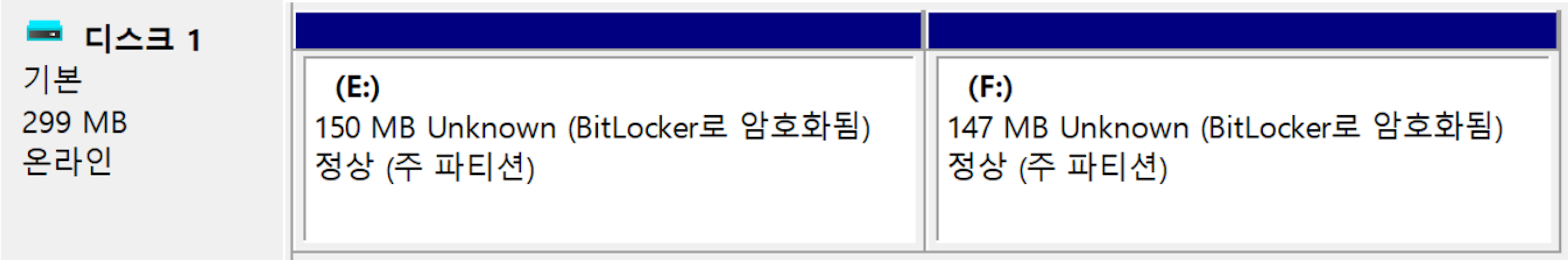 다중 파티션의 경우는 300MB 크기의 디스크를 MBR로 초기화하고, 150MB 크기의 NTFS 파티션과 150MB크기의 FAT32 파티션으로 생성하였다. 이후에 디스크에 비트라커를 적용하였다.