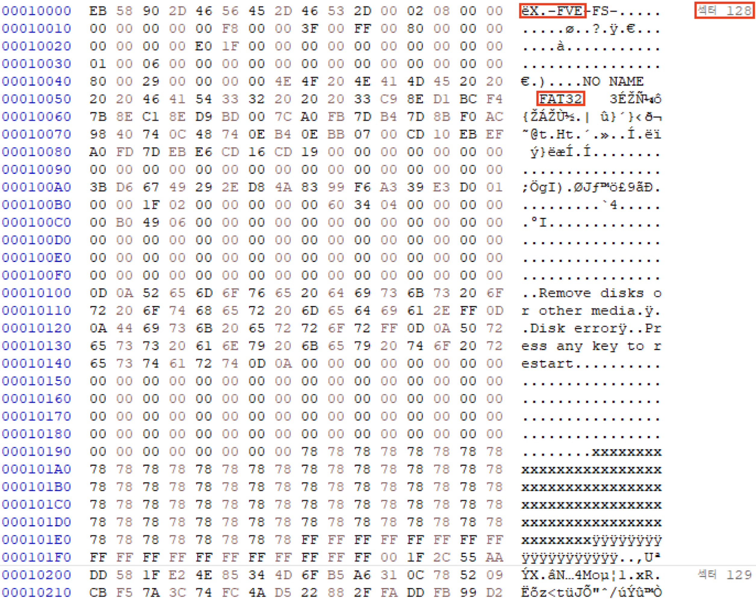128번 섹터로 이동해 본 모습니다. FVE-FS-을 통해 File System이 FVE(Full Volume Encryption)되었음을 알 수 있다. 즉 해당 파티션은 비트라커가 적용되었음을 알 수 있다. 또한 NTFS임에도 불구하고, FAT이라는 텍스트가 존재하며, 다음섹터에 BOOTMGR 또한 존재하지 않는다.
