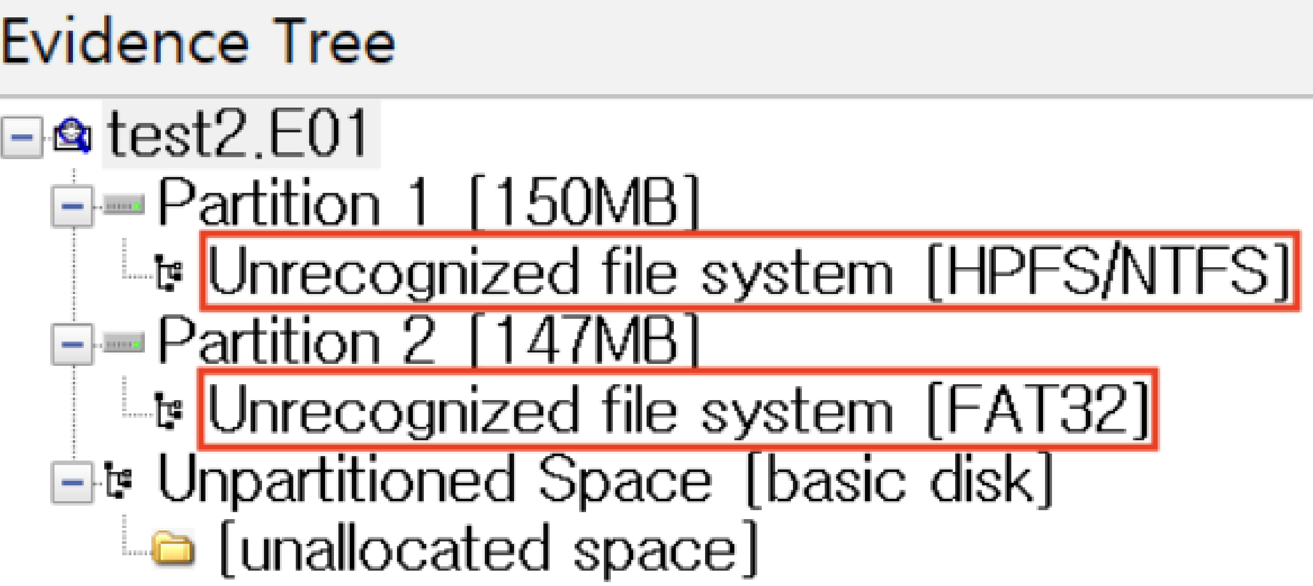 비트라커가 적용된 다중 파티션을 E01으로 이미징 하고 FTK Imager의 Avidence Tree에 업로드한 경우 Unrecognized File System문구가 나타난다.