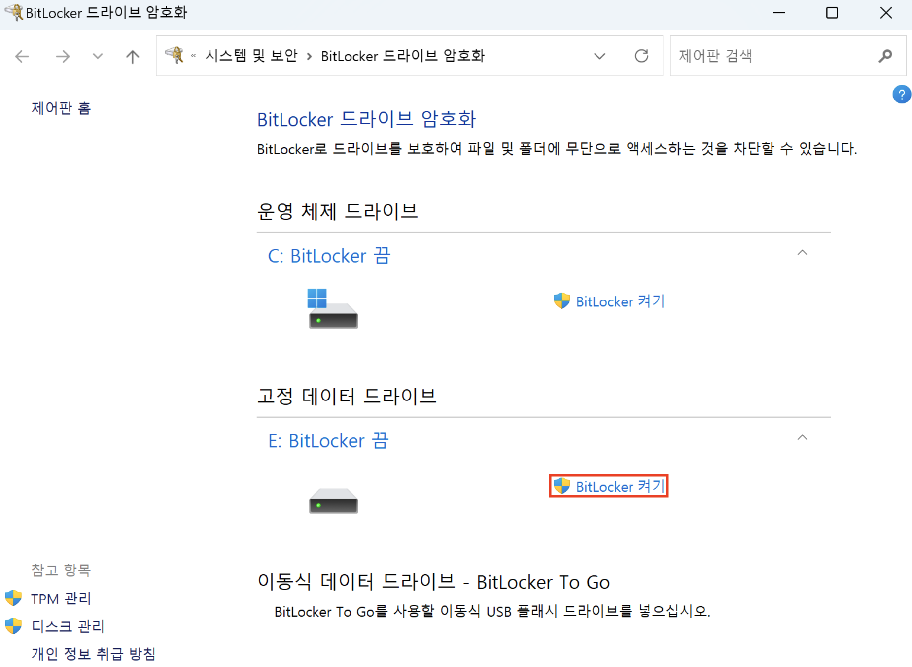'BitLocker 드라이브 암호화' 시스템으로 이동하고, 암호화하려는 드라이브의 'BitLocker 켜기'를 선택한다.