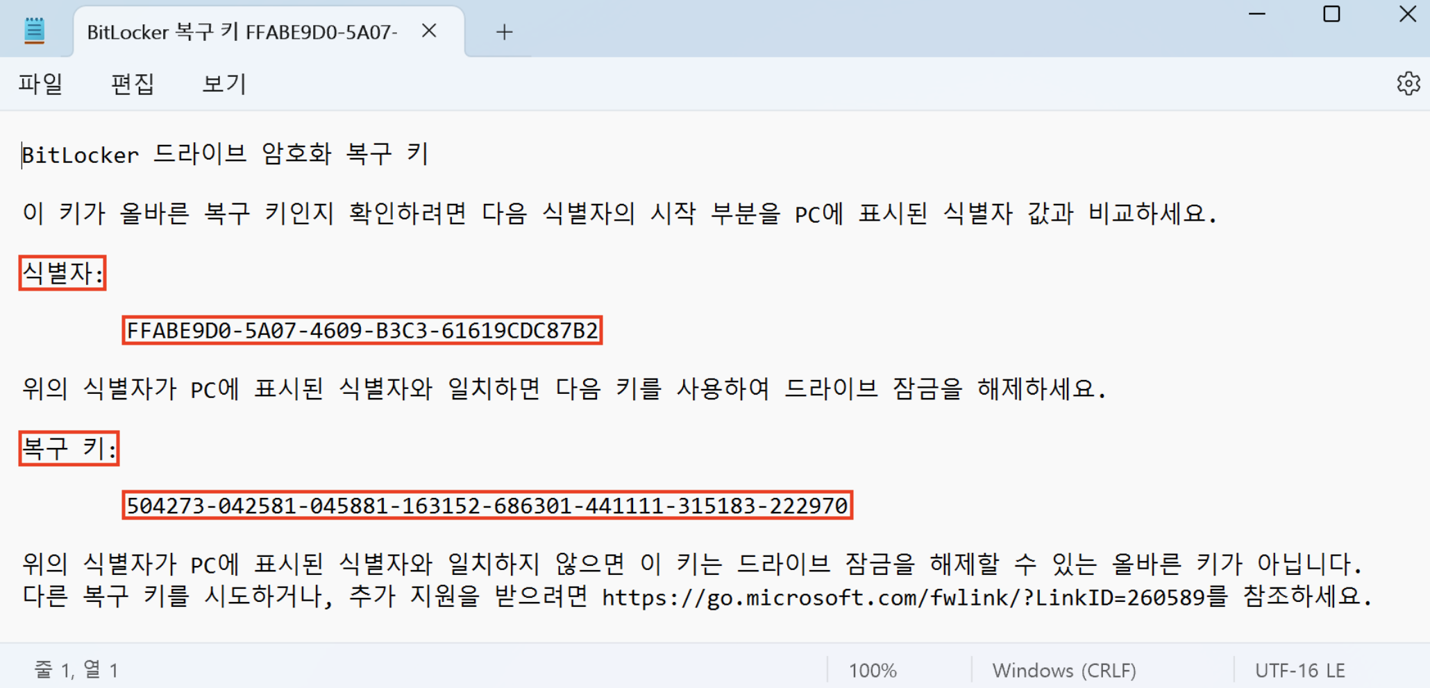 비트라커의 복구 키는 구체적으로 '식별자'와 '복구 키'로 나뉜다. 식별자는 각 드라이브에 알맞은 복구 키 쌍을 식별하는 데에 사용되는 값이고, 복구 키는 48자리의 순수 복구 키값을 의미한다. 해당 txt 파일을 열면 식별자와 복구 키가 존재한다.