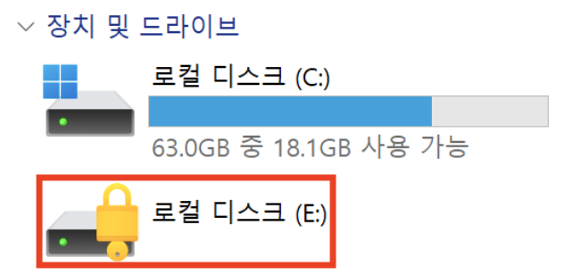비트라커가 적용된 드라이브는, 잠금 아이콘과 함께 디스크가 표시된다.