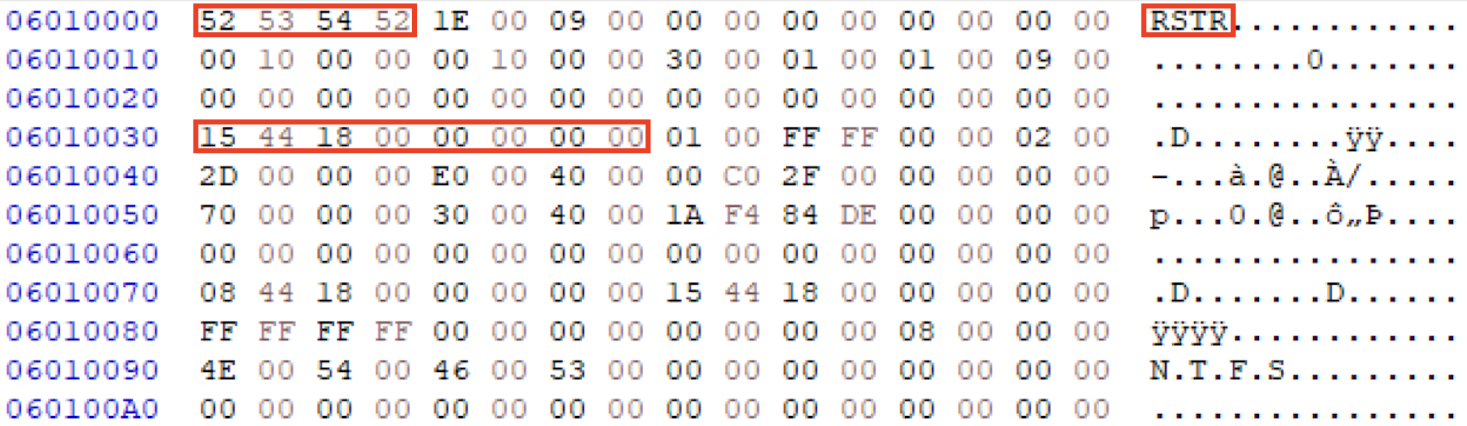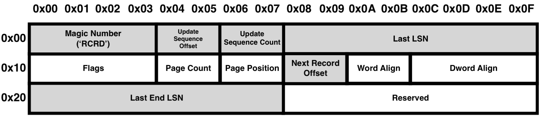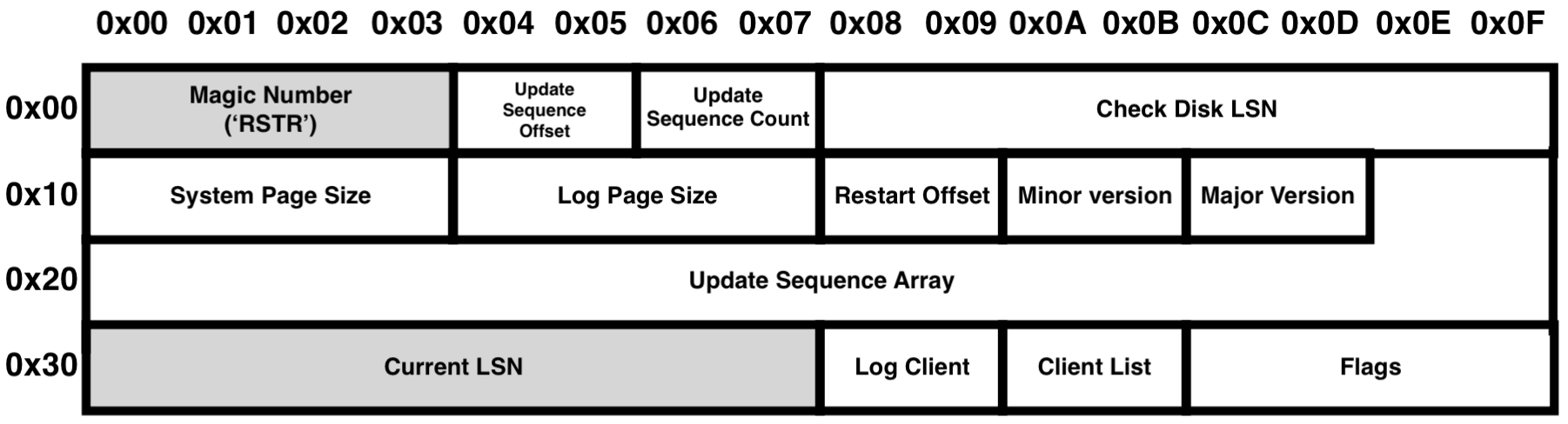 Restart Page: Magic Number로 Restart를 의미하는 'RSTR'가 존재하고, Current LSN 정보를 이용해 로그 레코드 기록의 재시작을 돕는 페이지이다. Current LSN 정보는 NTFS가 새롭게 로그 레코드를 작성할 때 새롭게 작성해야 할 다음 레코드 영역으로의 접근을 돕는 중요한 역할을 한다. NTFS는 재시작 영역의 Current LSN 정보를 읽고 해당 LSN 정보를 가지고 있는 로그 레코드를 찾아 다음 레코드부터 새롭게 로그 레코드를 기록한다.