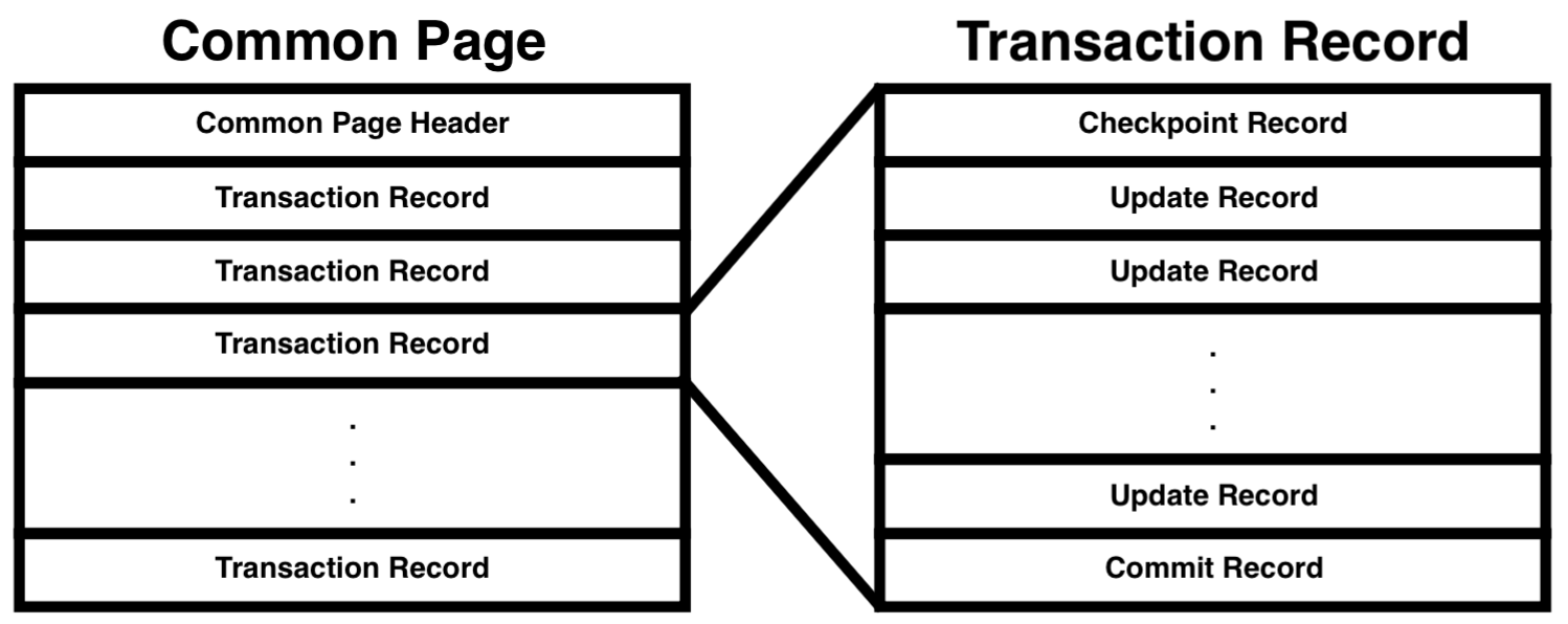 Common Page: 실제 주된 로그 내용을 담고 있는 페이지로 Common Page Header와 여러 개의 트랜잭션 레코드의 집합으로 이루어져 있다. 하나의 트랜잭션 레코드는 Checkpoint Record, Update Record, Commit Record로 이루어져 있고, 하나의 트랜잭션 레코드에는 여러 개의 Update Record가 포함된다. 아래는 Common Page와 Record의 큰 구조를 시각화 한 모습이다.