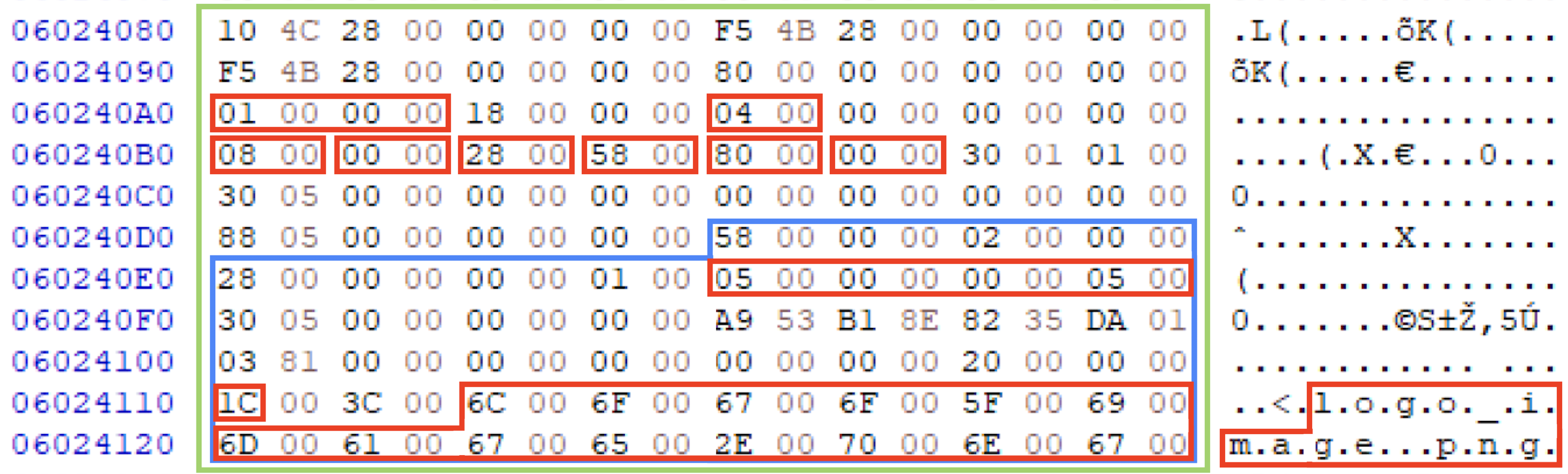 연두색 영역은 하나의 완전한 전체 Record 영역이다. Redo Offset(0x28), Redo Length(0x58) 값은 해당 라인(0x60240 B0)에서 0x28 뒤(0x60240 D8)부터 0x58까지의 영역(파란색 영역)을 의미한다. 해당 영역에는 Parent File Reference Address와 File Name Length, File Name이 존재한다. Undo Op의 값이 0x00이므로 이는 Noop(No Operation)을 의미하며, Undo Offset은 Redo 영역(파란색 영역)의 바로 다음을 가리키지만 Undo Length가 0x00으로 내용이 존재하지 않는다.