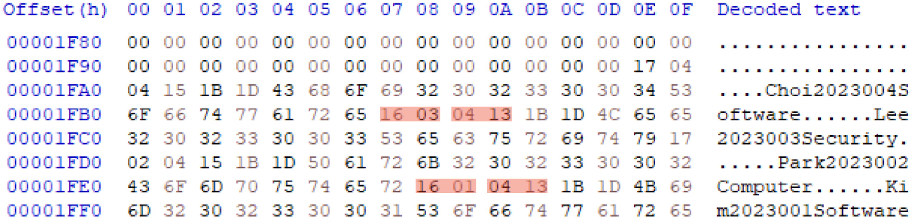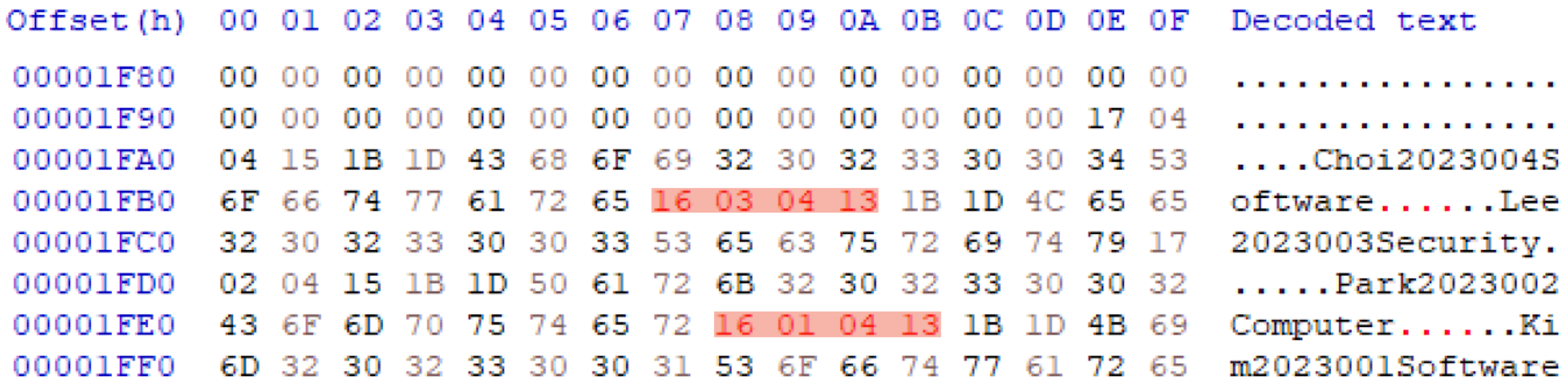 첫 번째 가용상태인 Cell의 첫 4 Byte: '0x0F E8 00 18' → '0x16 03 04 13'