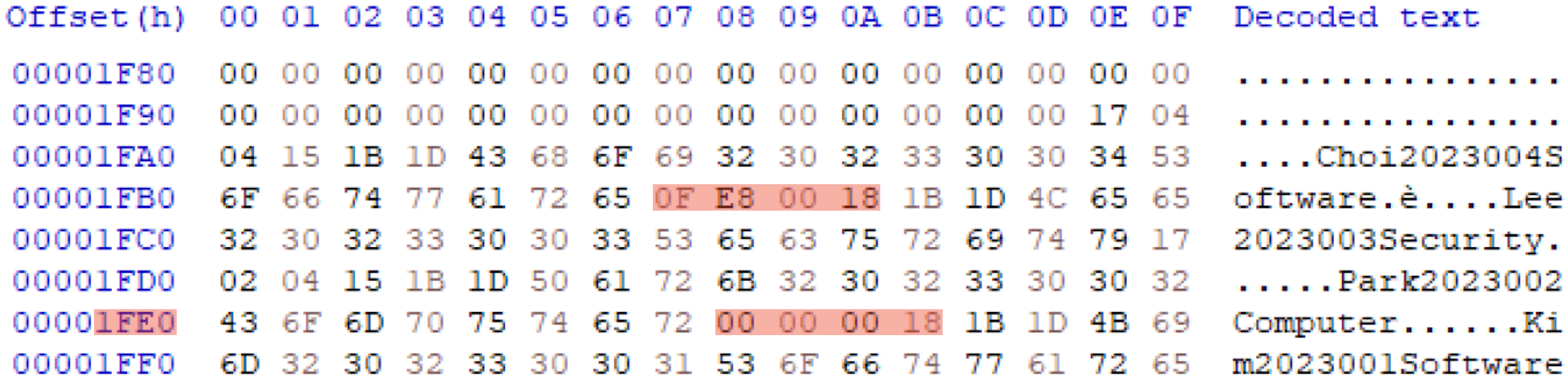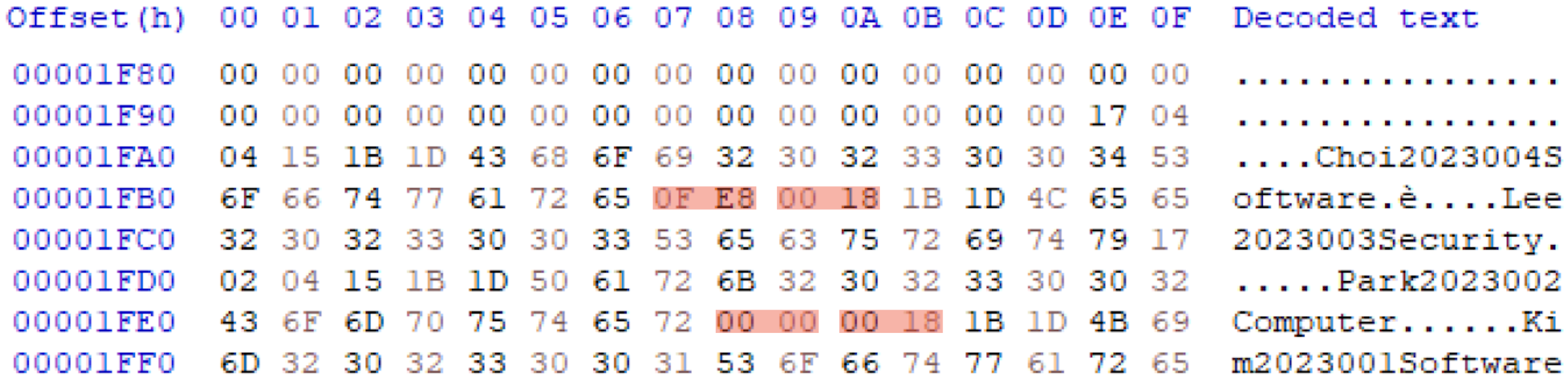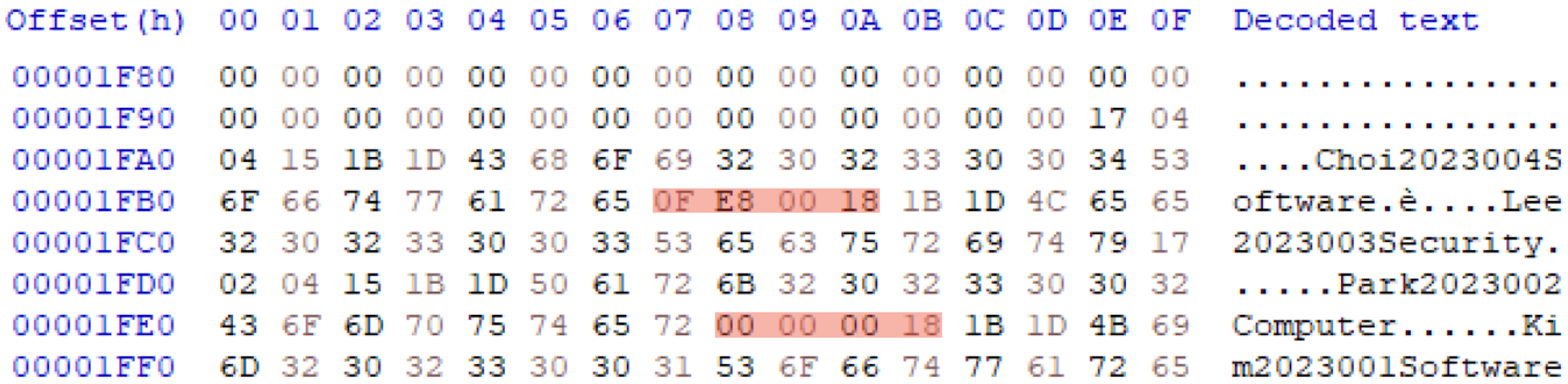 두 번째 가용상태인 Cell의 첫 4 Byte: '0x00 00 00 18' → '0x16 01 04 13'