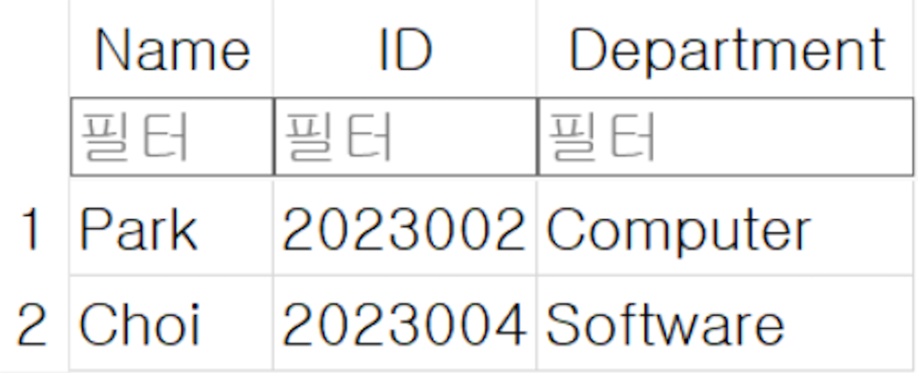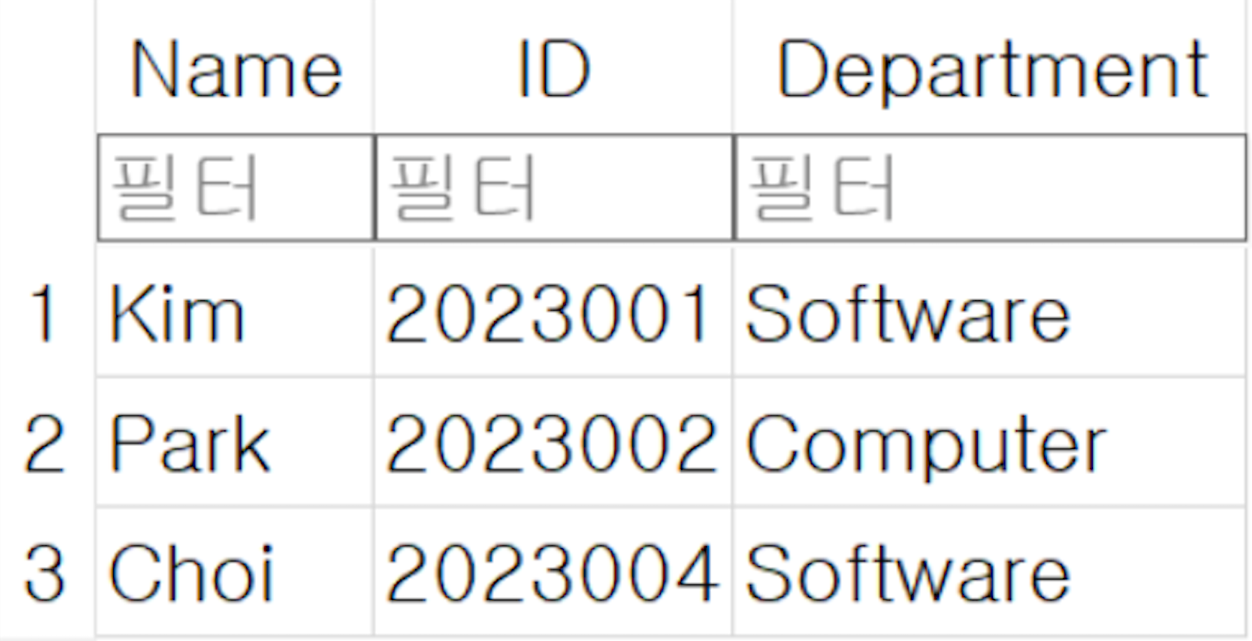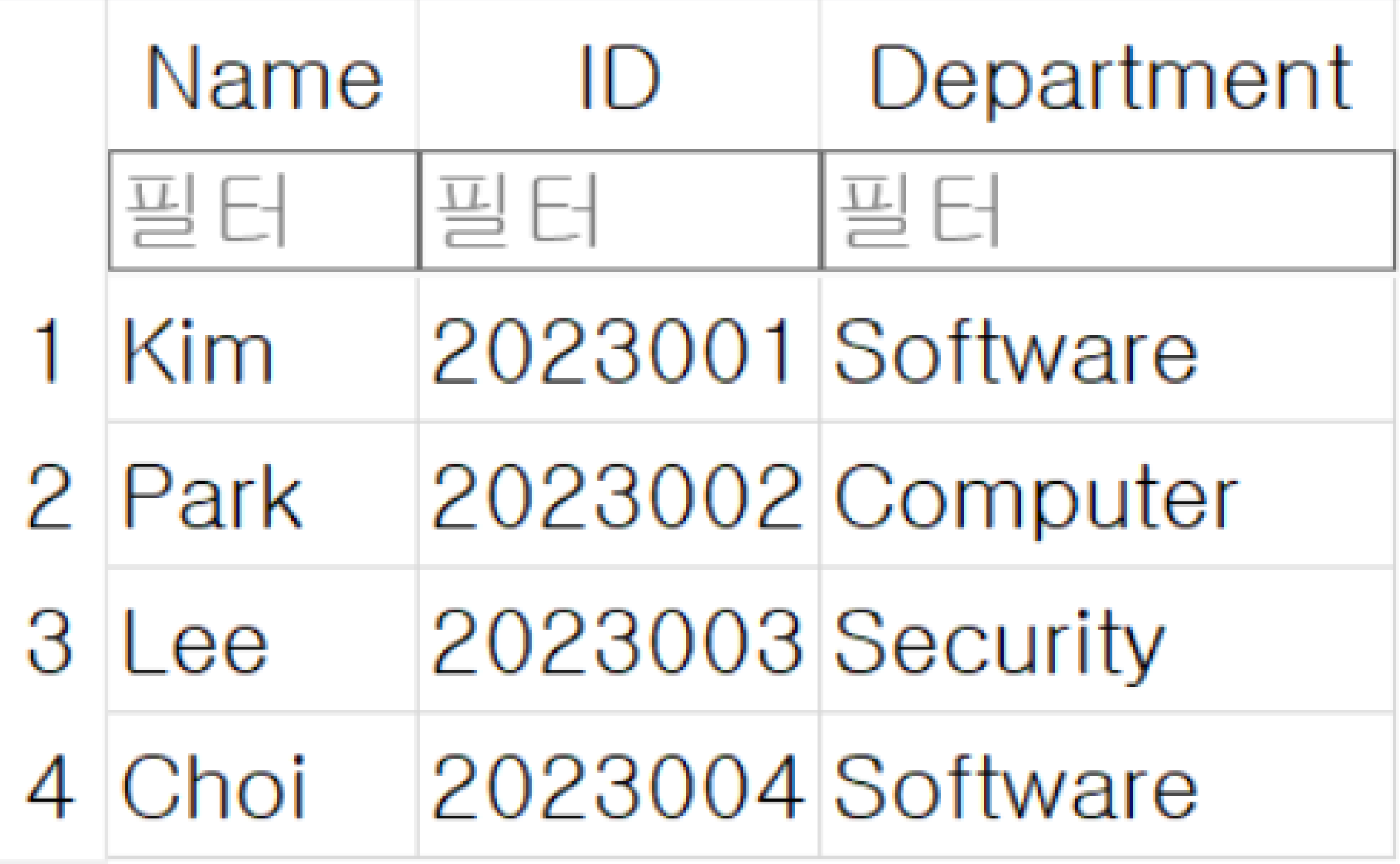 기존의 1, 2, 3번 3개의 Record에 추가적으로 Record('Choi', '2023004', 'Software')를 생성하였다.