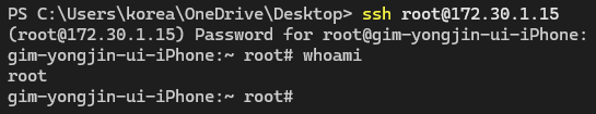 iOS 디바이스에서 SSH 설치 이후 Windows OS 환경의 PowerShell에서 iOS 디바이스 장치로 SSH 접속해 Root 권한 접속이 가능한지 확인한다. 이때, iOS 디바이스 장치의 IP는 "설정 > Wi-Fi'에서 연결된 네트워크 옆 'i' 아이콘"을 누르면 확인할 수 있다. 탈옥된 iOS 디바이스에 기본으로 설정되는 mobile 계정의 비밀번호는 alpine이기 때문에, 비밀번호는 alpine을 입력한다.
