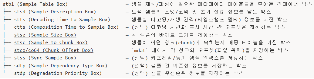 stbl (Sample Table Box)는 컨테이너 내부 Sample 들을 저장하는 컨테이너 박스이다.