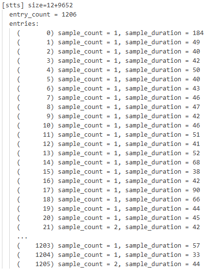 stts (Decoding Time to Sample Box)는 샘플별 디코딩/재생 간격(타임스탬프 델타) 정보를 가진 박스이다. stts 내부 Entry 1개가 여러 Sample을 포함할 수 있다. 이는 데이터 압축 효과를 갖기 때문이다.