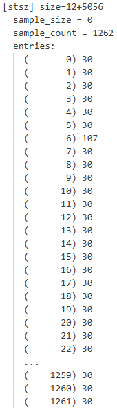 - 첫 번째 Chunk의 데이터 크기는 767 Byte를 가짐. (일곱 번째 Sample (여섯 번째 Entry)만 107 바이트의 데이터 크기를 가지고 나머지 Sample은 전부 30 바이트의 데이터 크기를 가짐)