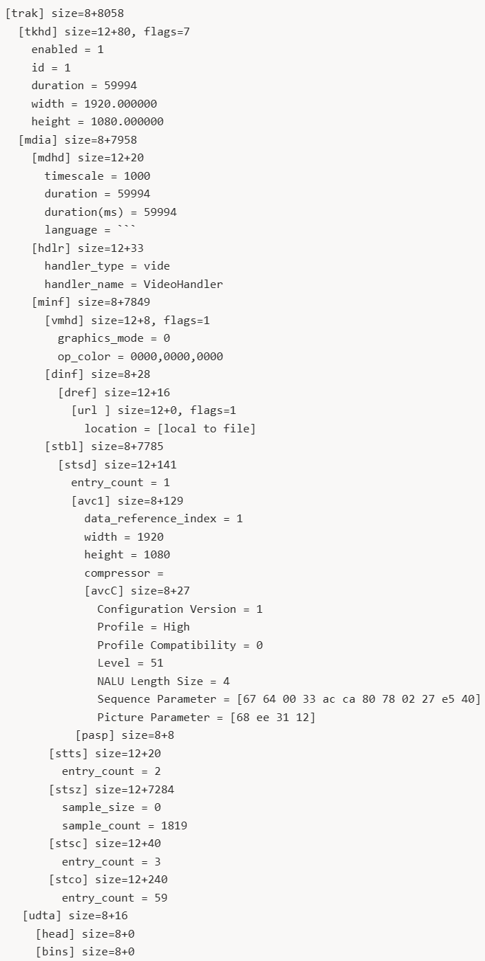 아래는 실제 mp4를 대상으로 특정 Track 영역의 정보를 파싱한 모습이다. (해당 파싱 도구와 옵션은 이후 목차인 도구 사용에서 다루었다.)