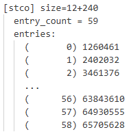 stco/co64 (Chunk Offset Box)는 mdat 내부 각 청크의 오프셋(파일 위치)을 저장하는 박스로, stco의 entry 갯수는 stsc의 청크 갯수와 정확하게 일치한다.