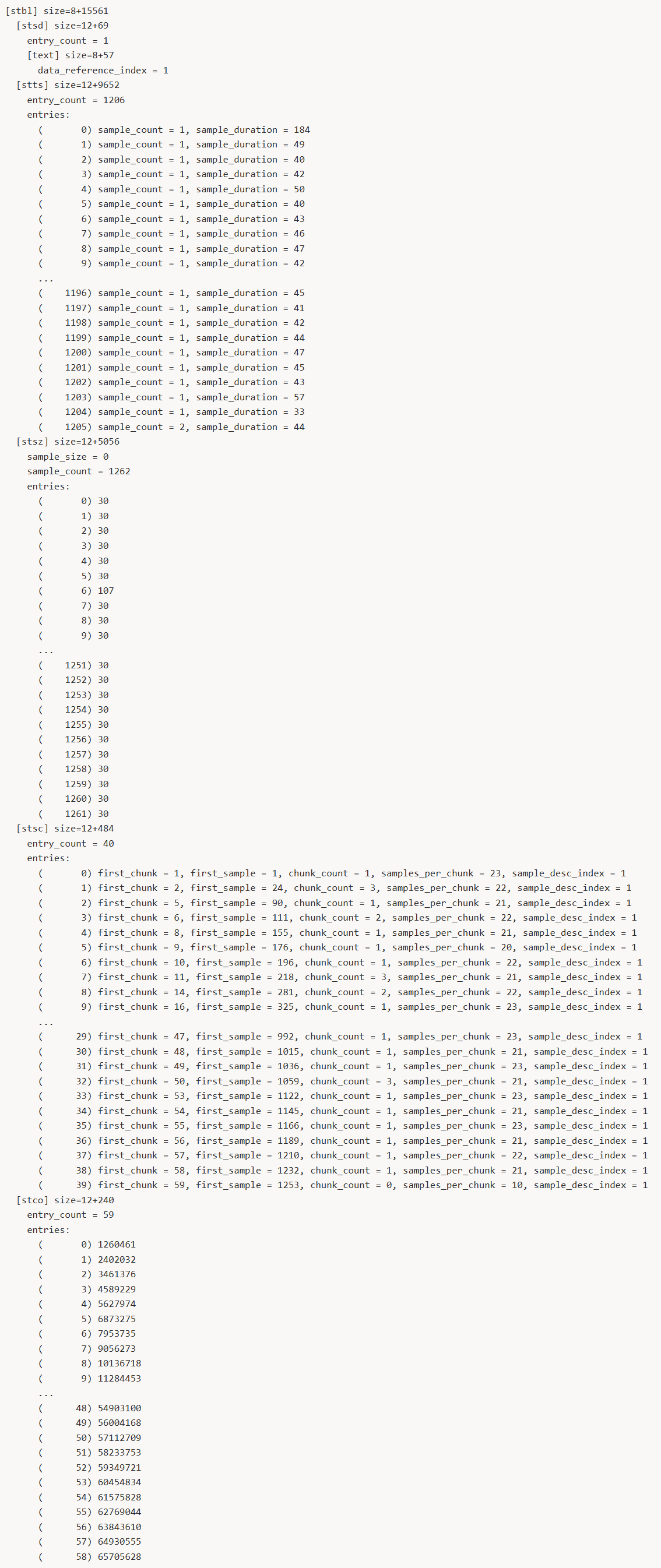 아래는 실제 mp4를 대상으로 특정 stbl 영역의 정보를 파싱한 모습이다. (해당 파싱 도구와 옵션은 이후 목차인 도구 사용에서 다루었다.)